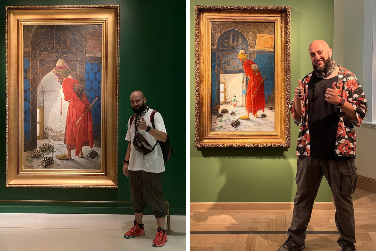 Osman Hamdi Bey'in ikonik eseri "Kaplumbağa Terbiyecisi"nin iki farklı versiyonunu yukarıdaki