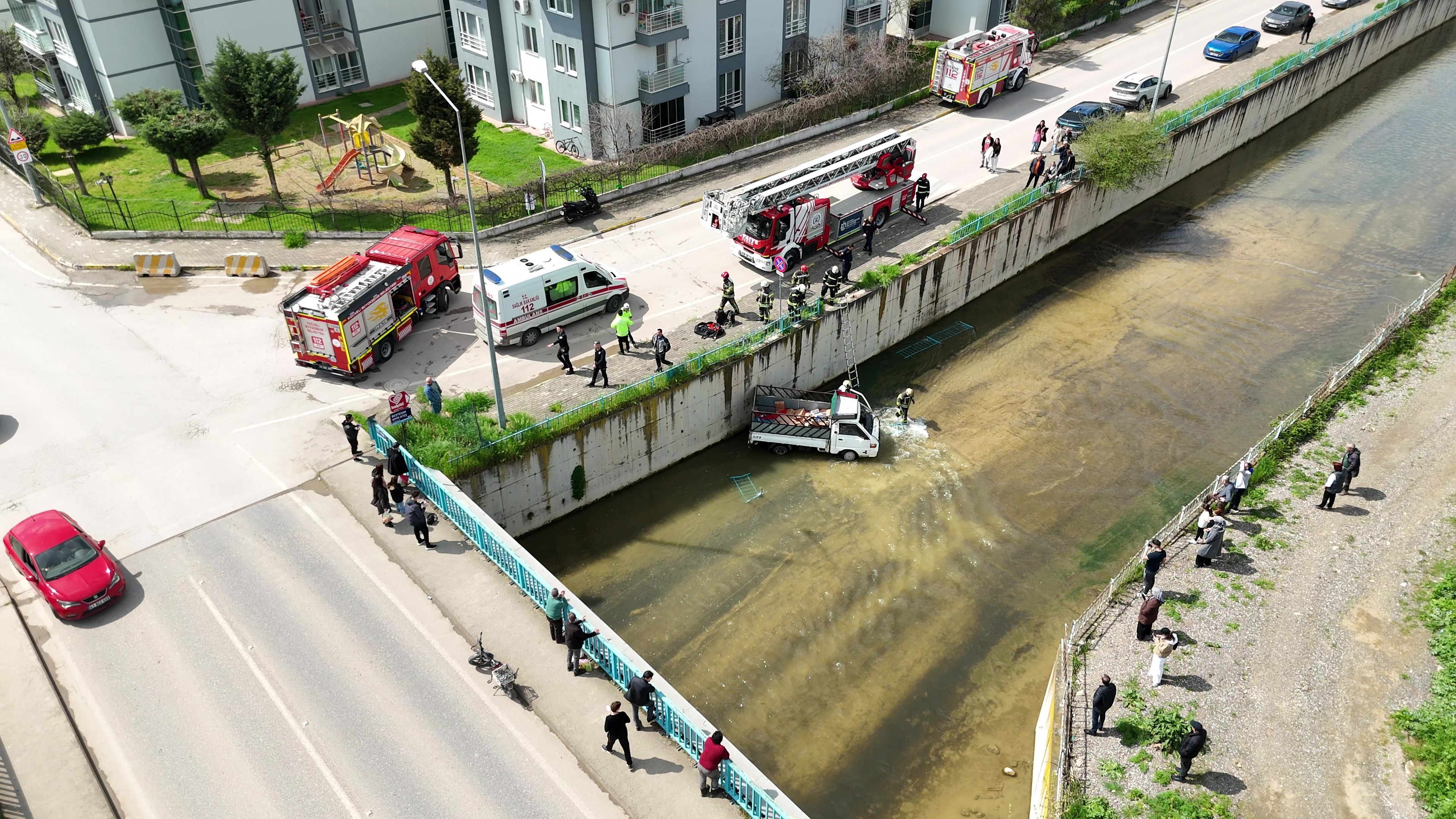 Öte yandan, kamyonetin demir korkulukları parçalayarak dereye uçtuğu anlar çevredeki bir sitenin güvenlik kamerası tarafından saniye saniye kaydedildi. Ekiplerin çalışması ve olay yeri, dron ile havadan da görüntülendi.