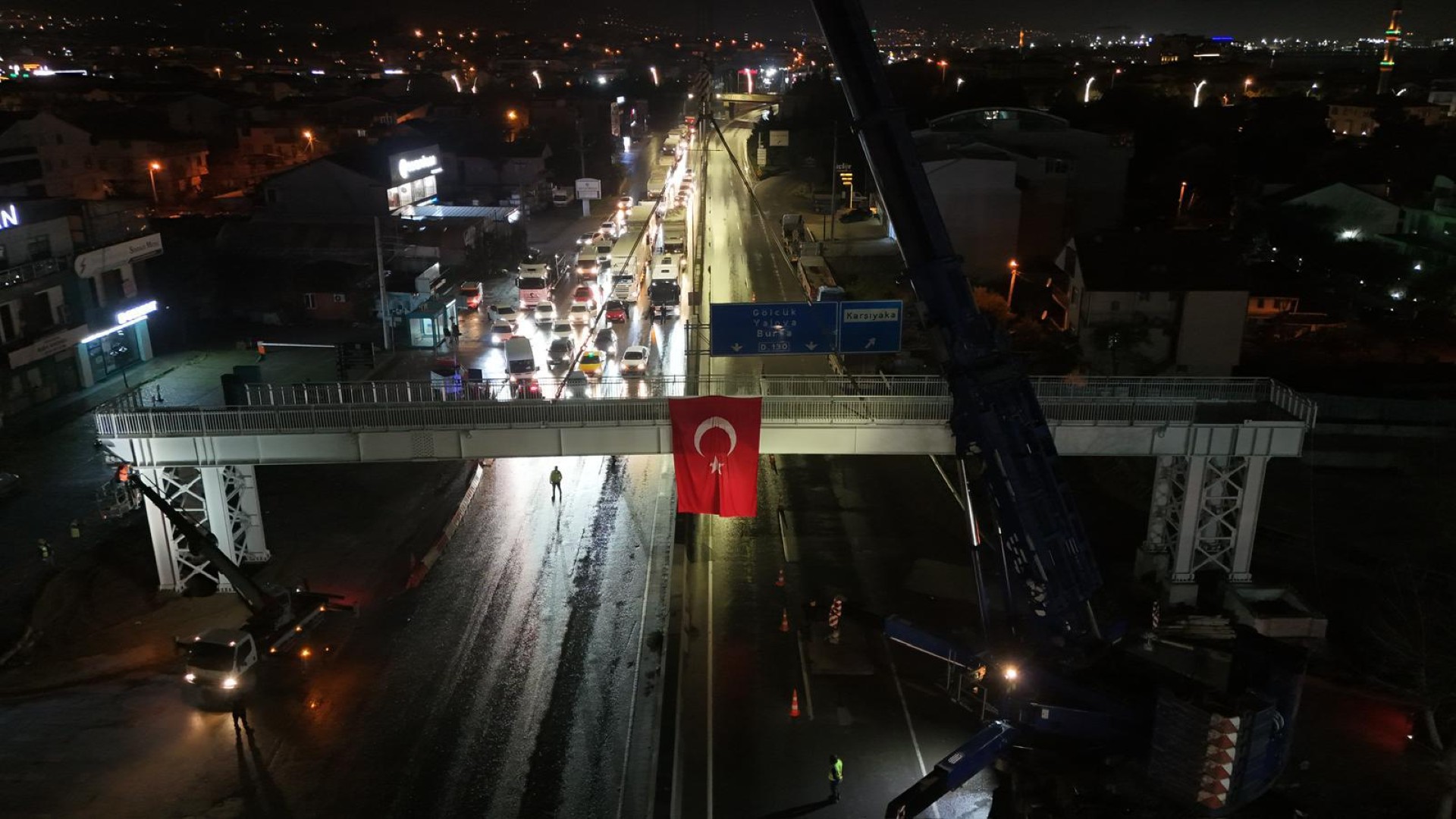 Kocaeli Büyükşehir Belediyesi’nin, D-130 Karayolu’nda ulaşımı daha hızlı, düzenli ve güvenli hâle getirecek Başiskele Kavşağı Koridor Projesi’nde çalışmalar hızlı bir şekilde ilerliyor. Silueti iyice ortaya çıkan dev projede ilerleme seviyesi yüzde 60’a yaklaştı. Ekipler, projenin zamanında tamamlanması amacıyla gece saatlerinde de çalışıyor. Başiskele Kavşağı Koridor Projesi kapsamında, Kasap Durağı mevkiindeki yaya üst geçidinin tabliye montajı da trafiğin aksatılmaması adına gece yürütülen çalışma ile tamamlandı. D-100 trafiğini İzmit ve Gölcük istikametinde kapatan ekipler, 52 metre uzunluğunda ve 78 ton ağırlığındaki dev yapının tabliye montajını bitirdikten sonra üst geçide Türk bayrağını astı.