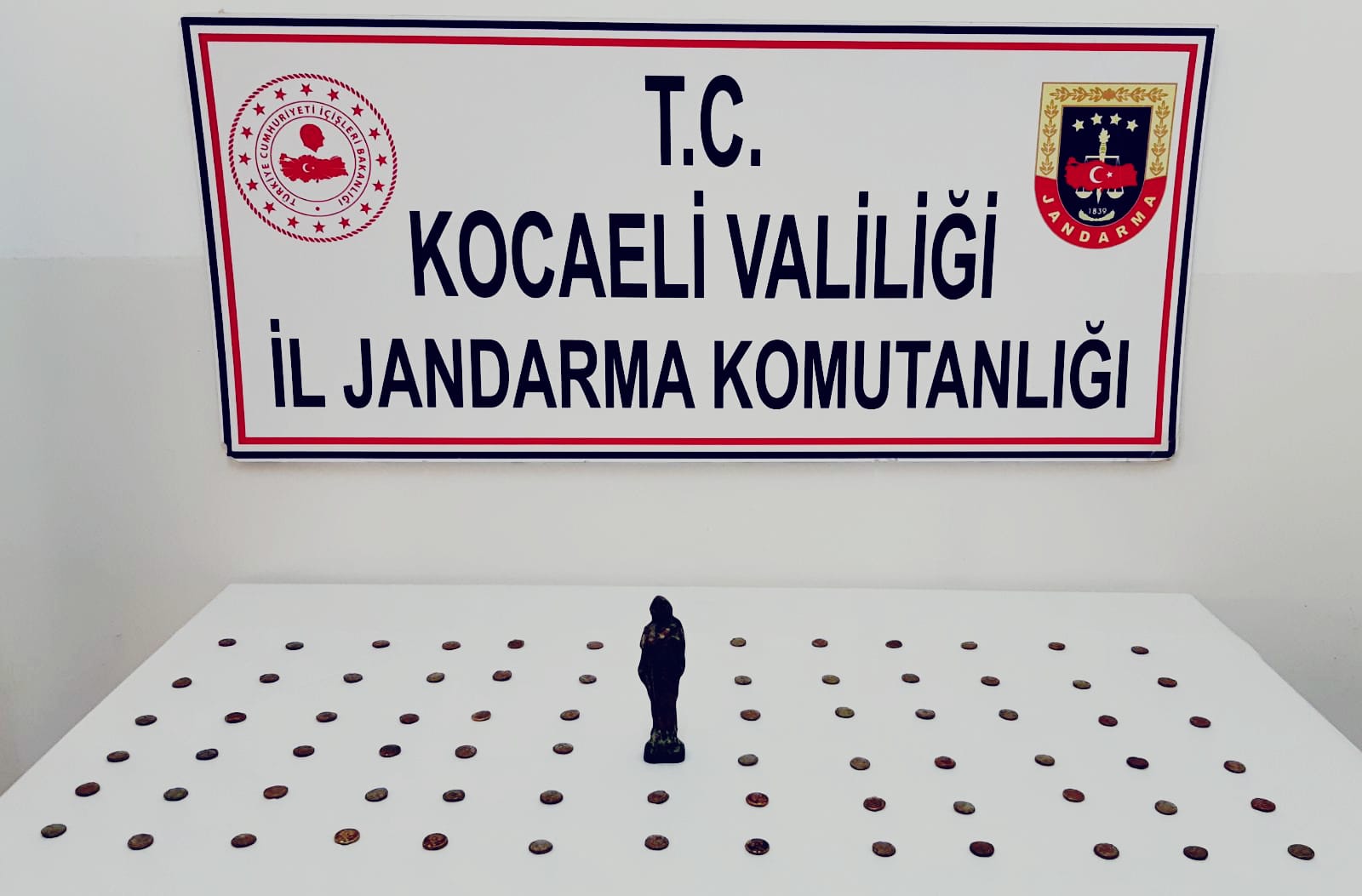 Bu kapsamda Körfez ilçesinde durdurulan bir araçta yapılan aramada, tarihi eser olduğu değerlendirilen Helenistik ve Yunan dönemlerine ait 77 bronz sikke ve Meryem Ana figürlü heykel ele geçirildi.