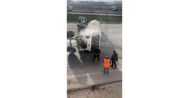 Kocaeli TEM Otoyolu gişelerinde kontrolden çıkan beton mikseri yan yattı, sürücü balyozla camı kırarak kendi imkanlarıyla araçtan çıktı.