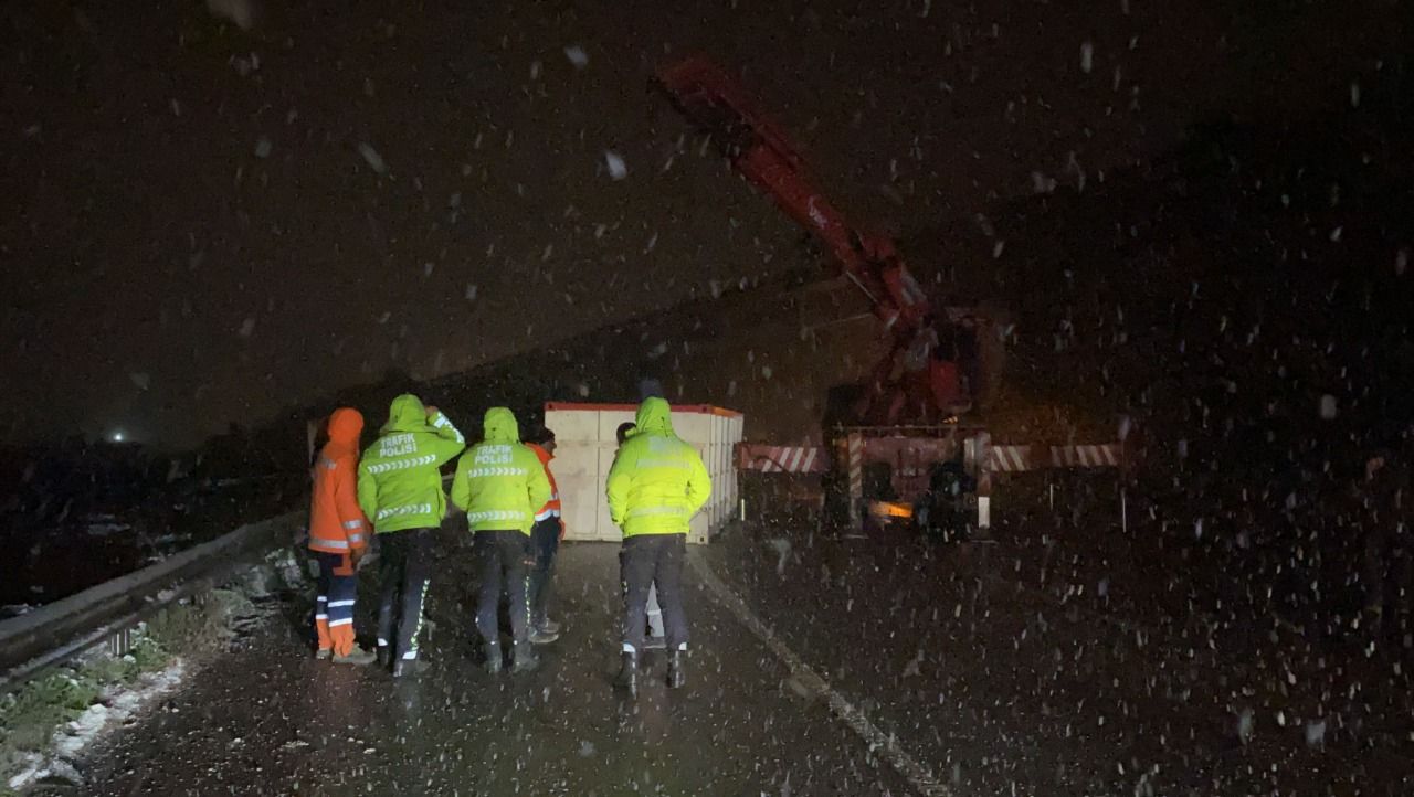 Körfez ilçesi D-100 Karayolu üzerinde karlı yolda kayan tırın taşıdığı konteyner yola devrildi. Tır sürücüsü hafif yaralanırken, D-100 uzun süre ulaşıma kapandı.