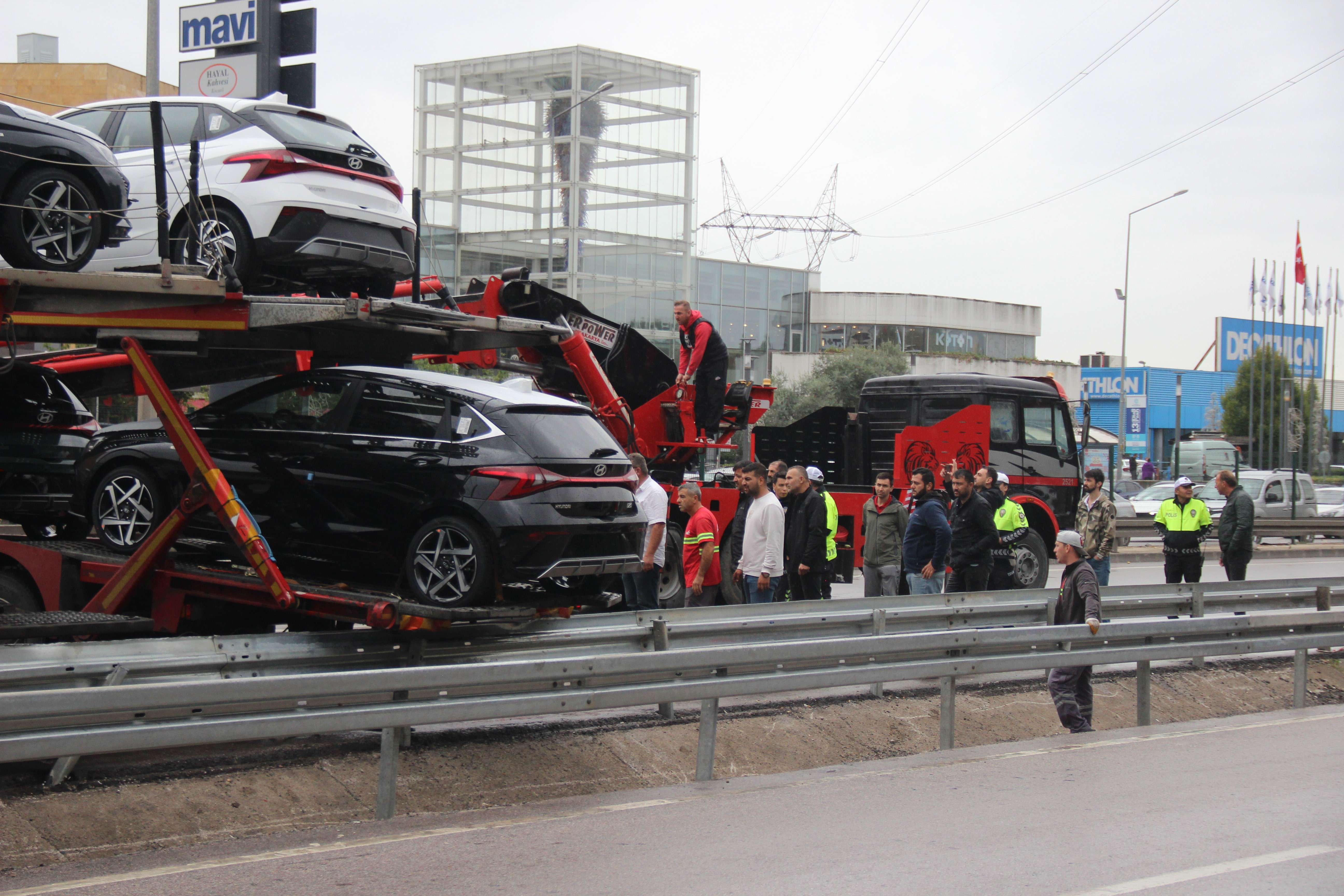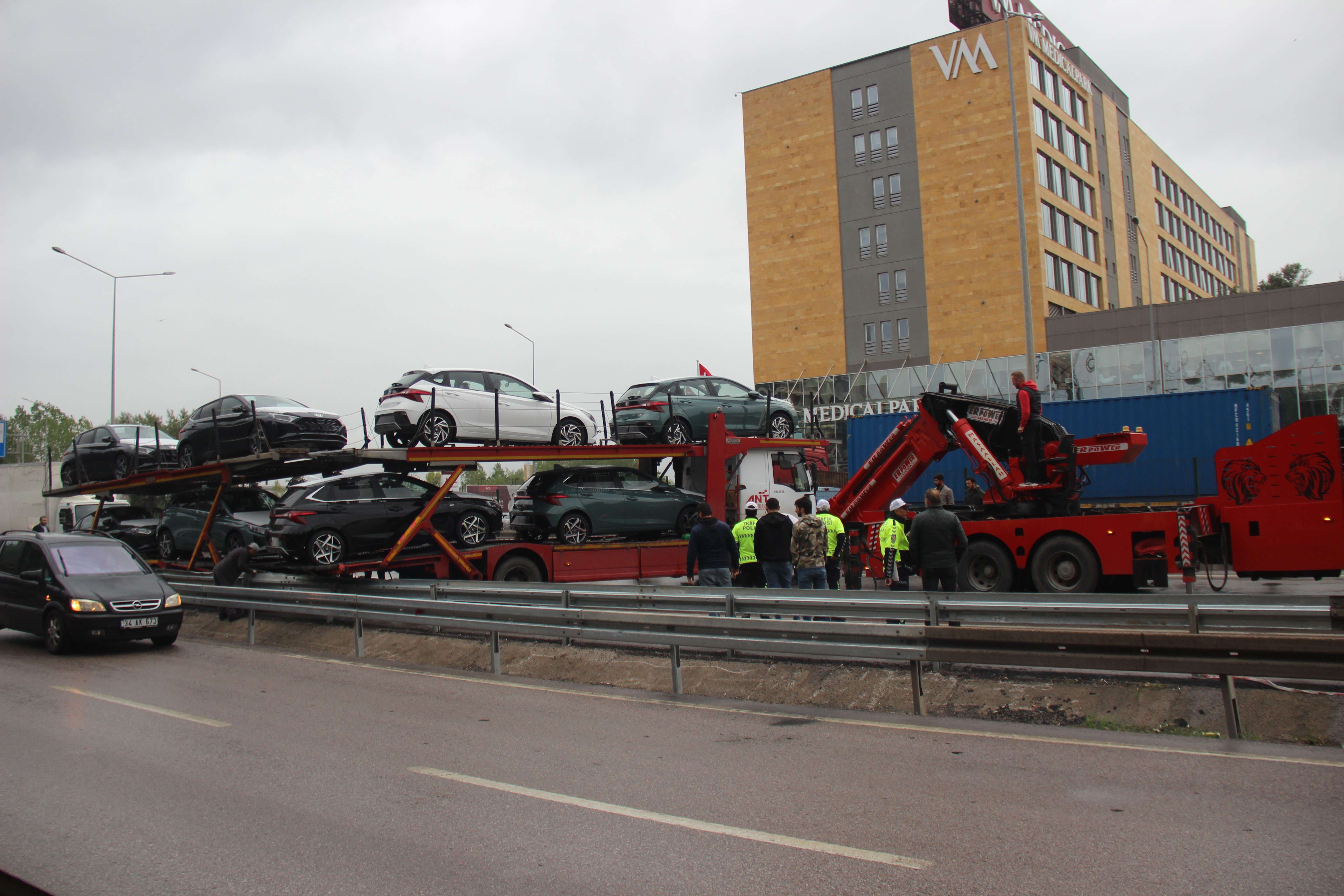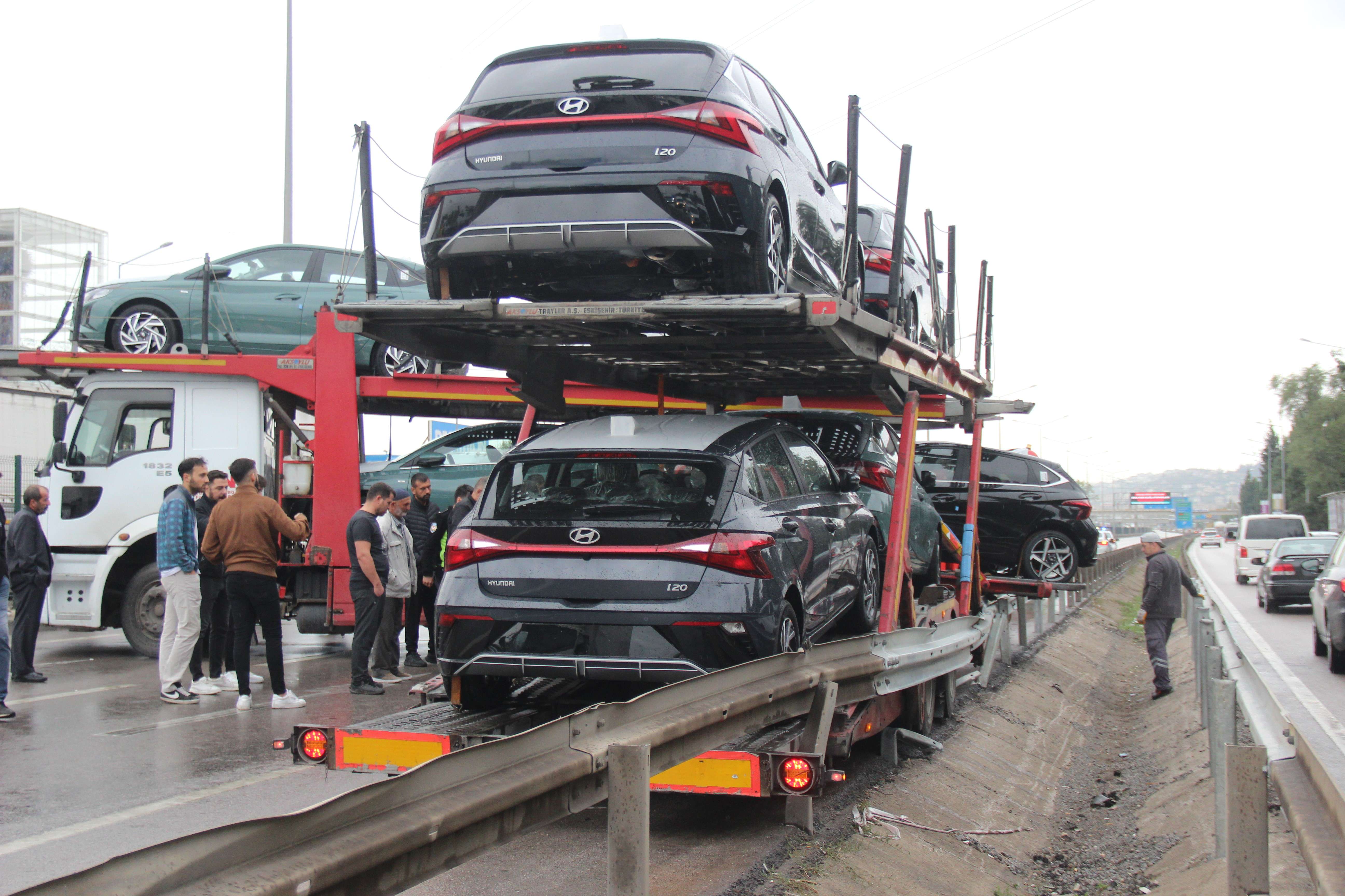 Kocaeli'nin İzmit ilçesinde yağış sonrasında kayganlaşan yolda sürücüsünün direksiyon hakimiyetini kaybettiği 8 sıfır araç yüklü tır, bariyerlere çarparak makaslama yaptı. Kazanın ardından D-100 kara yolu bir saat boyunca trafiğe kapandı.