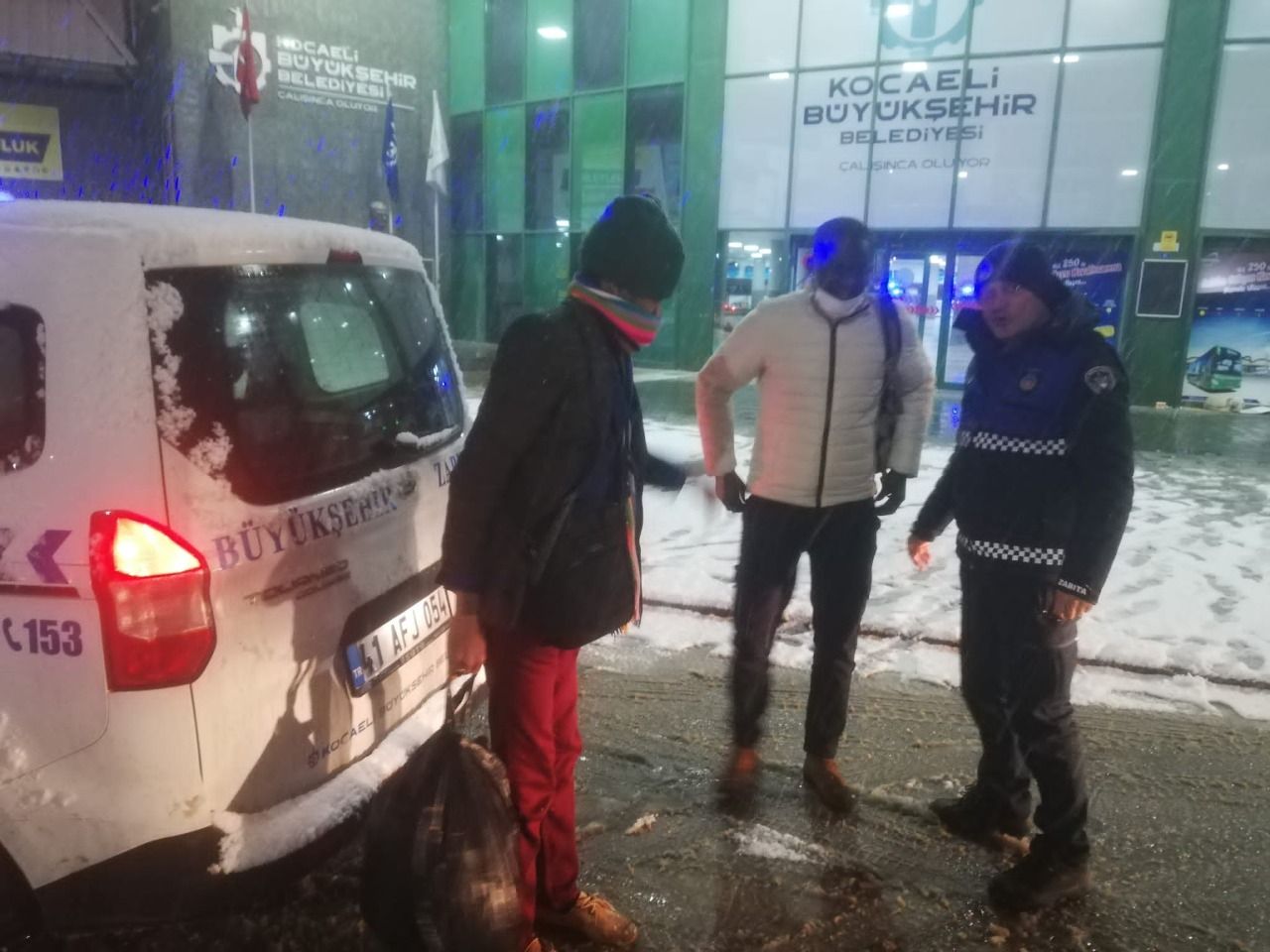 Zabıta ekipleri yoğun kar yağışının yaşandığı süreçte yayaları unutmuyor. Sorumluluk sahasında devriye çalışmalarını sürdüren ekipler, asli görevlerinin yanı sıra cadde ve sokaklarda gördükleri yaşlı, engelli ve yürümekte zorluk çeken vatandaşları gidecekleri yerlere ulaştırıyor. Bu kapsamda gece 01.00 sıralarında Kocaeli Devlet Hastanesinde tedavi olan ve kar yağışı nedeniyle evlerine dönemeyen evli çifti Zabıta ekipleri Kuruçeşme Akpınar’da ki evlerine bıraktı.