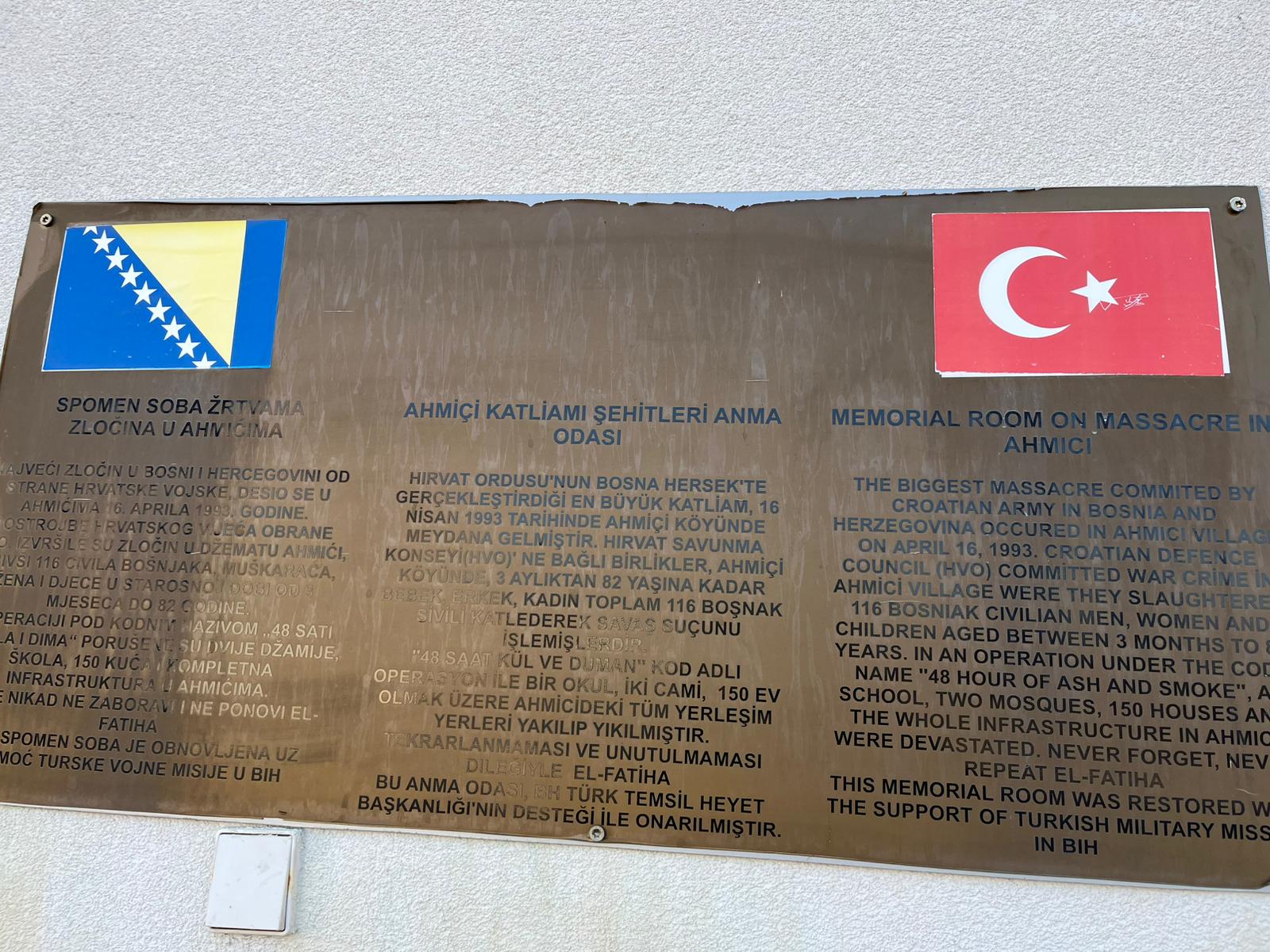cami imamını çivileyerek asmışlar. Ardından köy halkını camiye doldurup camiyi yakmışlar. Hırvat canileri tarafından şehit edilen Ahmetli köyü halkı için yapılan anıtı ziyaret ediyoruz. Müzeyi geziyoruz Tüylerimiz diken diken oluyor. bu nasıl bir vahşet nasıl bir katliam diye düşünüyoruz. ahmiçi şehitleri için Fatiha okuyup Dualarla yolumuza devam ediyoruz.(İKTAV ARAŞTIRMA MERKEZİ. Devri alem belgesel tv programı )