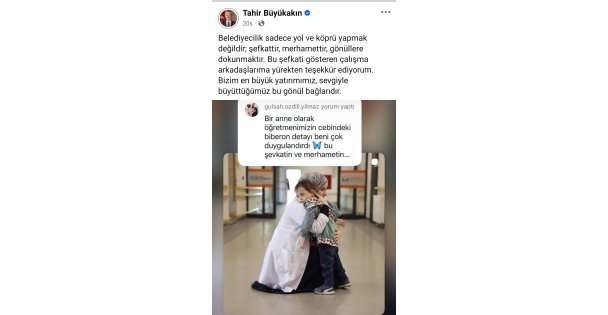 Gülşah Özdil Yılmaz isimli bir takipçi söz konusu fotoğraf için, "Bir anne olarak öğretmenimizin cebindeki biberon detayı beni çok duygulandırdı. Bu, şefkatin ve merhametin en güzel örneği" yorumunu yaptı. Başkan Büyükakın bu yorumu sayfasına taşıdı ve, "Belediyecilik sadece yol ve köprü yapmak değildir; şefkattir, merhamettir, gönüllere dokunmaktır. Bu şefkati gösteren çalışma arkadaşlarıma yürekten teşekkür ediyorum. Bizim en büyük yatırımımız, sevgiyle büyüttüğümüz bu gönül bağlarıdır" yorumuyla yeniden paylaştı.