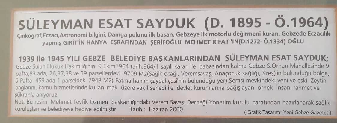 Gebze belediyesinin ilk belediye başkanlarından Esat Sayduk'un kendisi ve annesine Fatma hanıma ait sağlık merkezi ve park yapılması için bağışladıkları 17 bin m2 arazisi araştırılmalı ve Esat Sayduk'un sağlık merkezine adının verilmesi ile ilgili vasiyeti yerine getirilmeli.