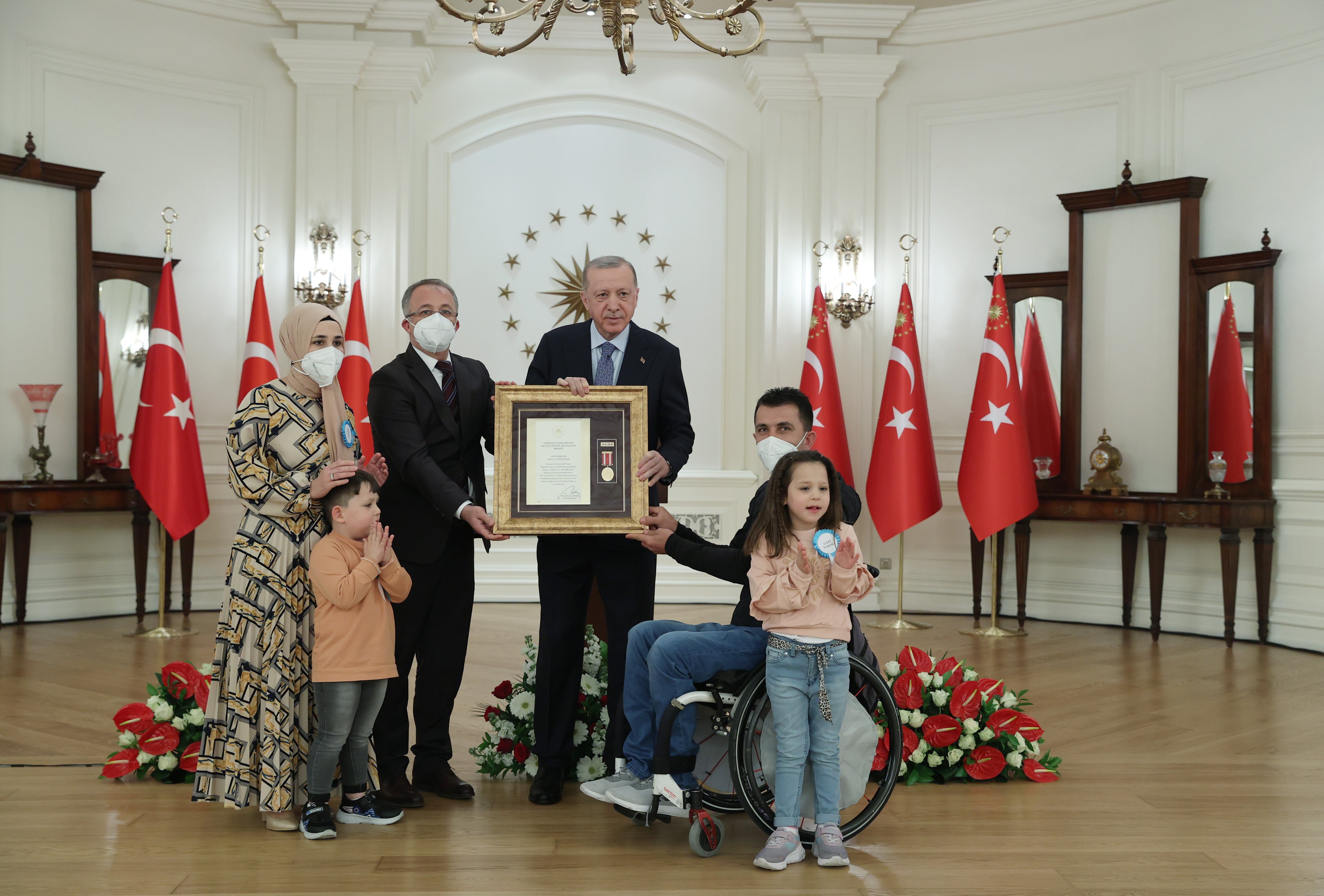 Bugün, Ankara'da ikamet eden 26 şehit yakını ve gazilere devlet övünç madalyası tebliğ ettiklerini, diğer illerde de 350 hak sahibine Cumhurbaşkanı'nı temsilen valiler tarafından madalyalarının takdim edildiğini ifade eden Erdoğan, böylece ülke genelindeki 376 şehit yakını ve gaziye devlet övünç madalyalarını tevcih ettiklerini söyledi.