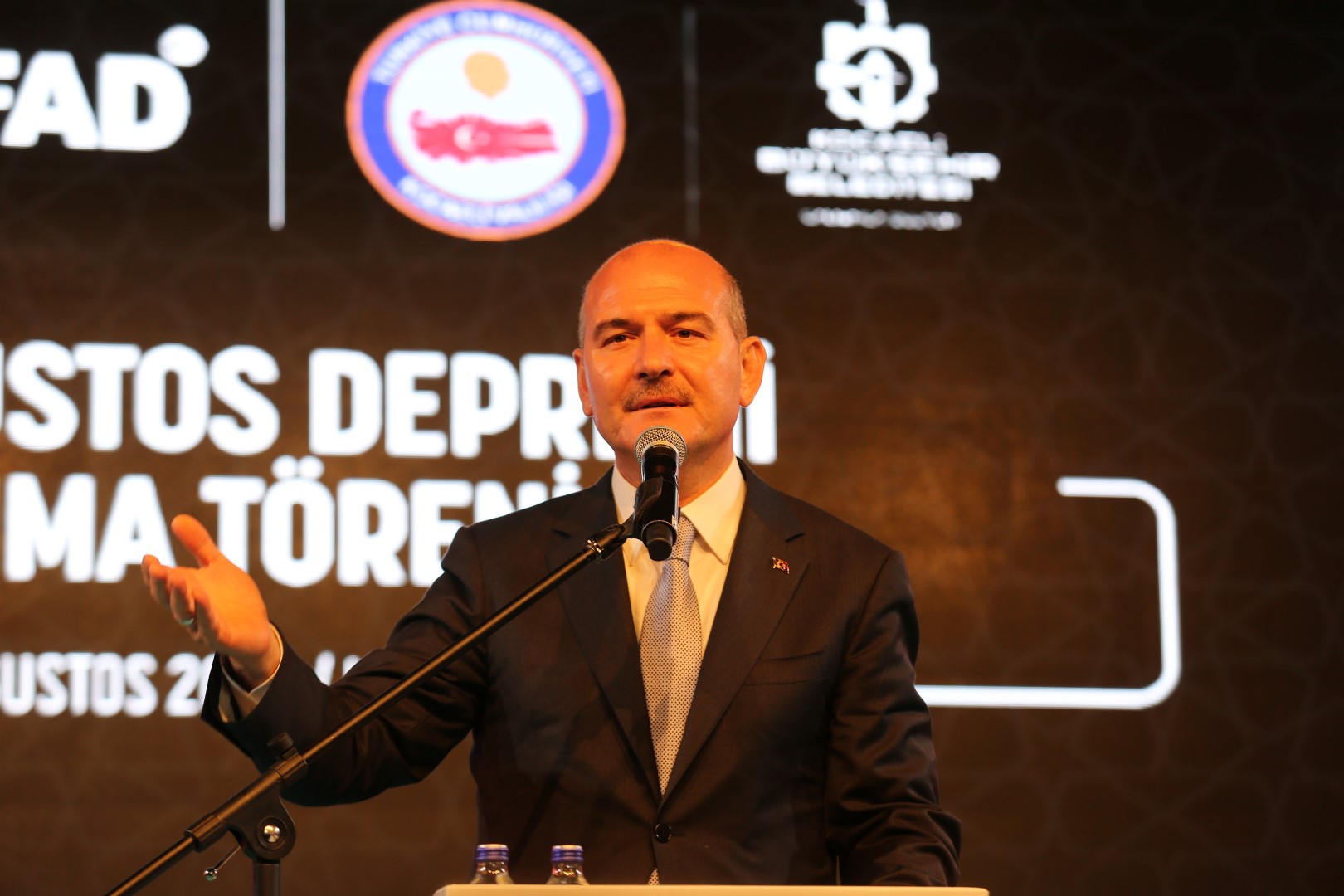 ‘’Biz depremi unutabiliriz ama deprem bizi unutmaz’’ diyen Bakan Soylu, “Türkiye deprem ülkesidir. AFAD, İçişleri Bakanlığına bağlandığından bu yana karşı karşıya kalmadığımız afet kalmadı. Afetler 4 kat arttı o tarihten bu yana. Her afetten sonra her sıkıntıdan sonra aklıma gelir anlatmaya da utanırım ama televizyonlarda muhabirlerin uzattığı mikrona ülkemizin insanlarının söylediği tek bir cümle vardı, ‘Nerede bu devlet?’. Tek bir kula bile biz nerede bu devlet dedirtmedik. O günden bugüne 23 yıldır bu çektiğimiz acılar ve travmalar üzerine herkes elinden geleni yaptı. Gücümüzün yettiği kadar afete dayanıklı bir Türkiye ortaya koymaya çalıştık. Dirençli şehirler yapmaya devam ediyoruz” dedi.