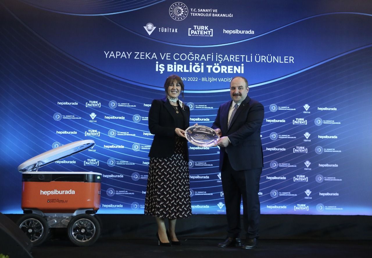 Yapay Zeka ve Coğrafi İşaretli Ürünler İş Birliği imza töreninin ardından Hepsiburada'nın kargo robotunun getirdiği plaket Hanzade Doğan tarafından Bakan Varank'a verildi. Bakan Varank daha sonra tescilli ürünlerin bulunduğu stantları gezerek üreticilerden bilgi aldı.