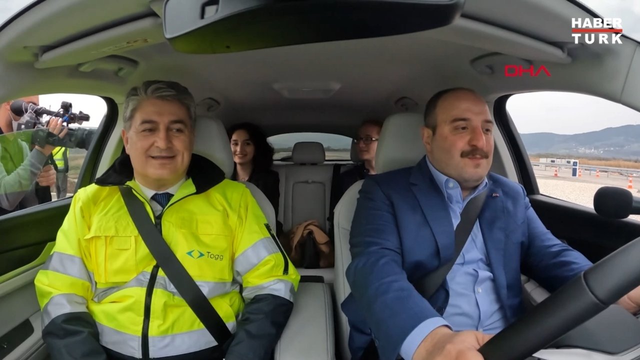 Togg’un arka koltuğunda Bakan Varank’ın sosyal medya üzerinden yaptığı çağrı sonucu davet edilen iki öğrenci yer aldı. Uludağ Üniversitesi Bilgisayar Mühendisliği öğrencileri Sena Bahadıroğlu ve Ferit Yiğit Balaban, Varank’ın test sürüşüne eşlik etti.