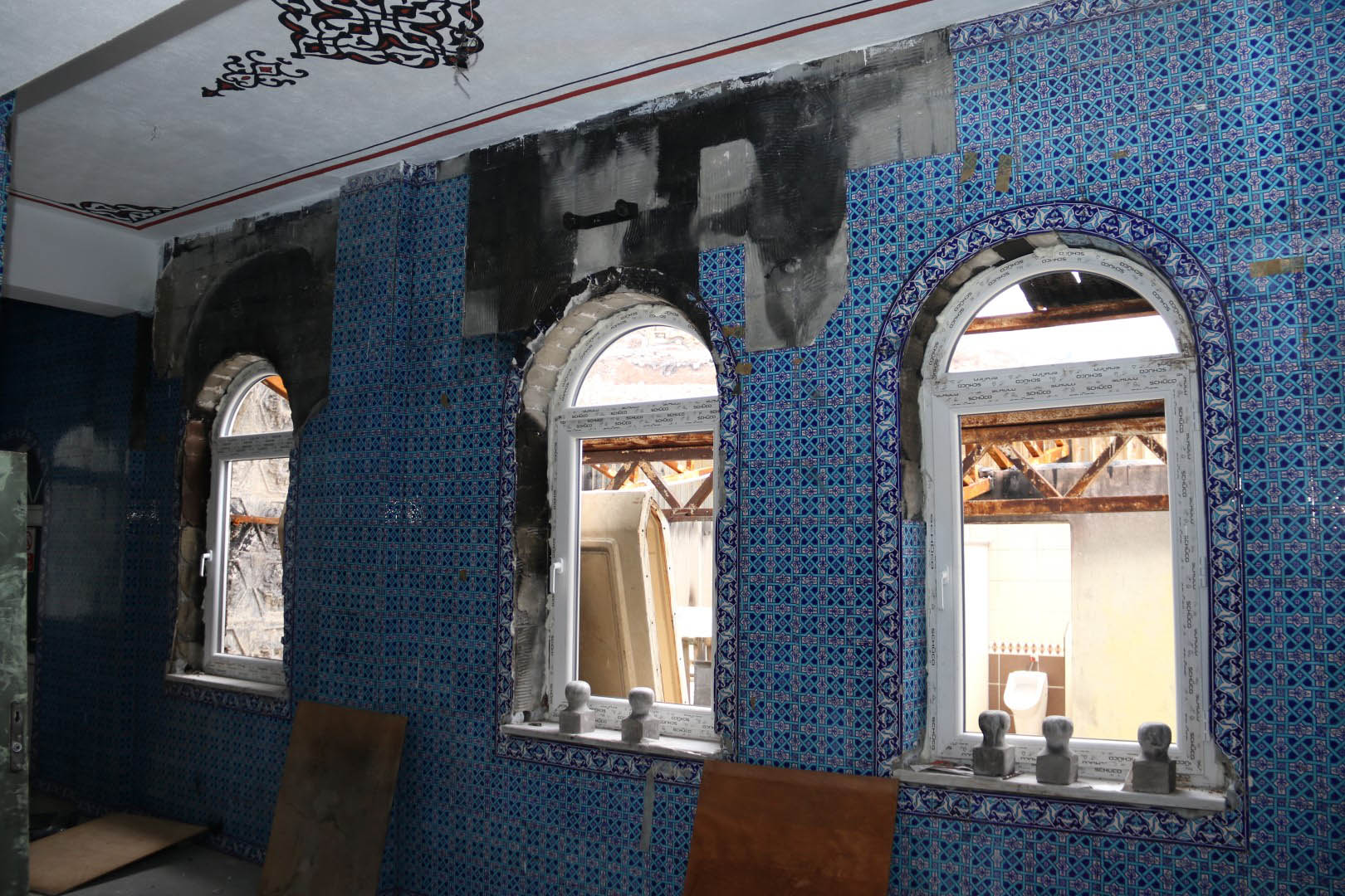 Yangında kullanılamaz hale gelen halıları, malzemeleri ve molozları kaldıran ekipler, çini ve fayansların islerini temizledi.