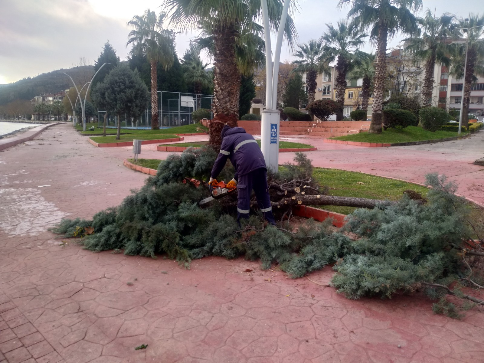 Kocaeli Büyükşehir Belediyesi ekipleri, şiddetli yağış, lodos ve fırtına uyarısına karşı teyakkuza geçti. Büyükşehir’in tüm ekipleri, fırtına nedeniyle yaşanan olaylara gündüz saatlerinde ve gece boyu müdahale etti. Kocaeli Büyükşehir Belediyesi ekipleri, meteorolojiden bildirilen şiddetli yağış ve fırtına uyarısına karşı teyakkuza geçti. Büyükşehir Belediyesi tüm birimleri ile yağış ve fırtına nedeniyle gelen ihbarlara anında müdahale etti. Fırtına nedeniyle kent genelinde bazı ağaçlar devrildi. Büyükşehir Belediyesi Park ve Bahçeler Dairesi Başkanlığı ekipleri, hemen olay yerlerine intikal ederek devrilen ağaçları kaldırıp, olası tehlikelerin önüne geçti. Bazı parklarda zarar gören ve tehlike arz eden ağaçlar da ekipler tarafından budandı.