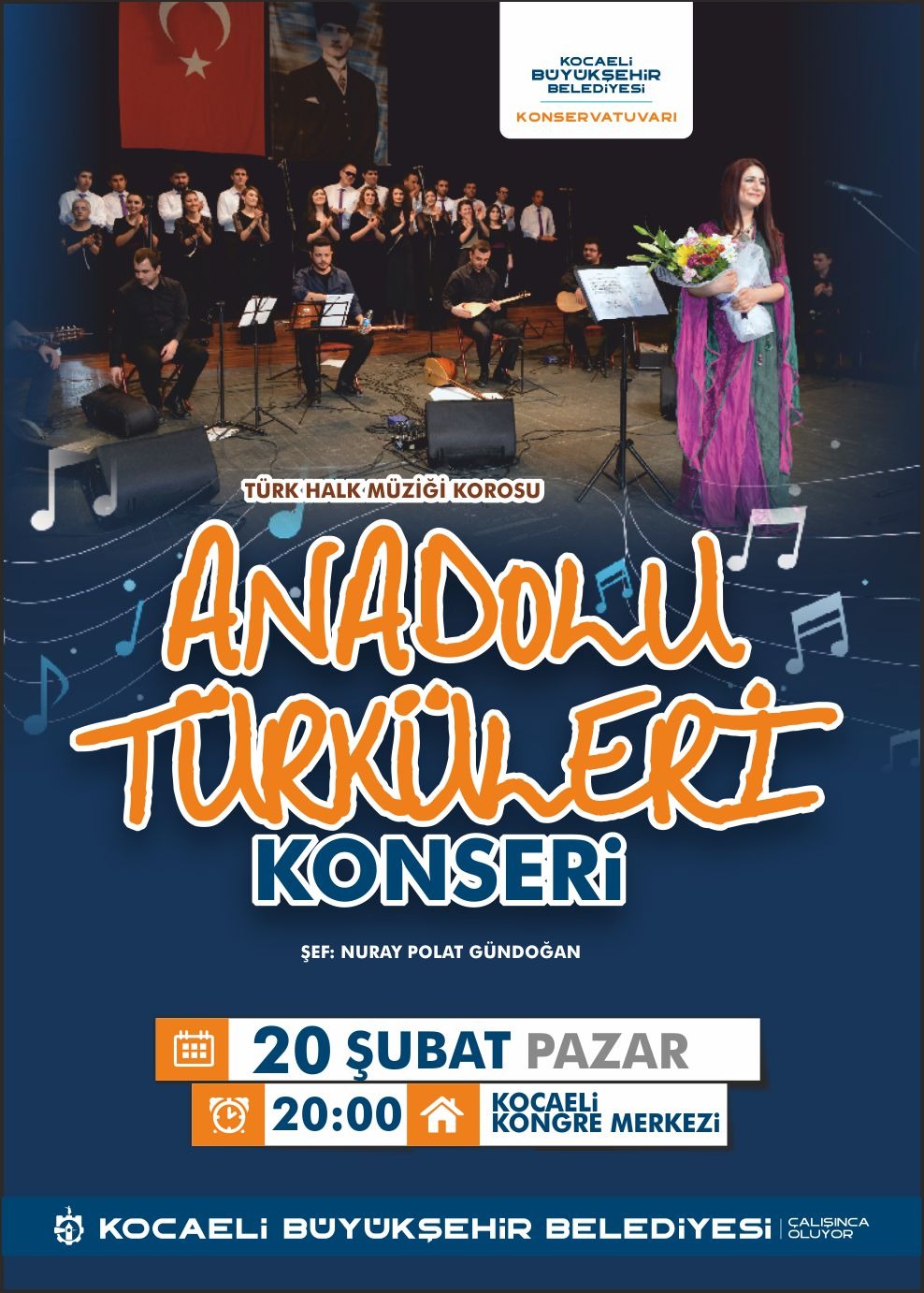 Kocaeli Büyükşehir Belediye Konservatuvarı bünyesinde faaliyet gösteren Türk Halk Müziği Korosu hafta sonunda vatandaşlara türkü ziyafeti sunacak. Büyükşehir Belediye Konservatuvarı THM Eğitmeni Nuray Polat Gündoğan yönetimindeki koro 20 Şubat Pazar akşamı “Anadolu Türküleri” konseri verecek. Kocaeli Kongre Merkezi’nde gerçekleştirilecek ücretsiz konser 20.00’de başlayacak.