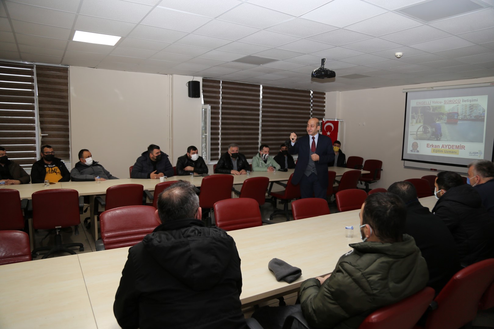 Sürücüler ile yolcu arasındaki ilişkileri olumlu yönde geliştirmek ve farkındalık oluşturmak amacıyla sunulan ‘Sürücü-engelli yolcu iletişimi’ eğitimi tam gün sürdü. 30 kişilik gruplar halinde verilen eğitim, kent genelindeki tüm sürücülere veriliyor. Her türlü teknik bilginin sunulduğu eğitimlerde farkındalık oluşturmak, engelli yolcularla doğru iletişim kurmak, nasıl davranılması gerektiğine dair konular işlendi.