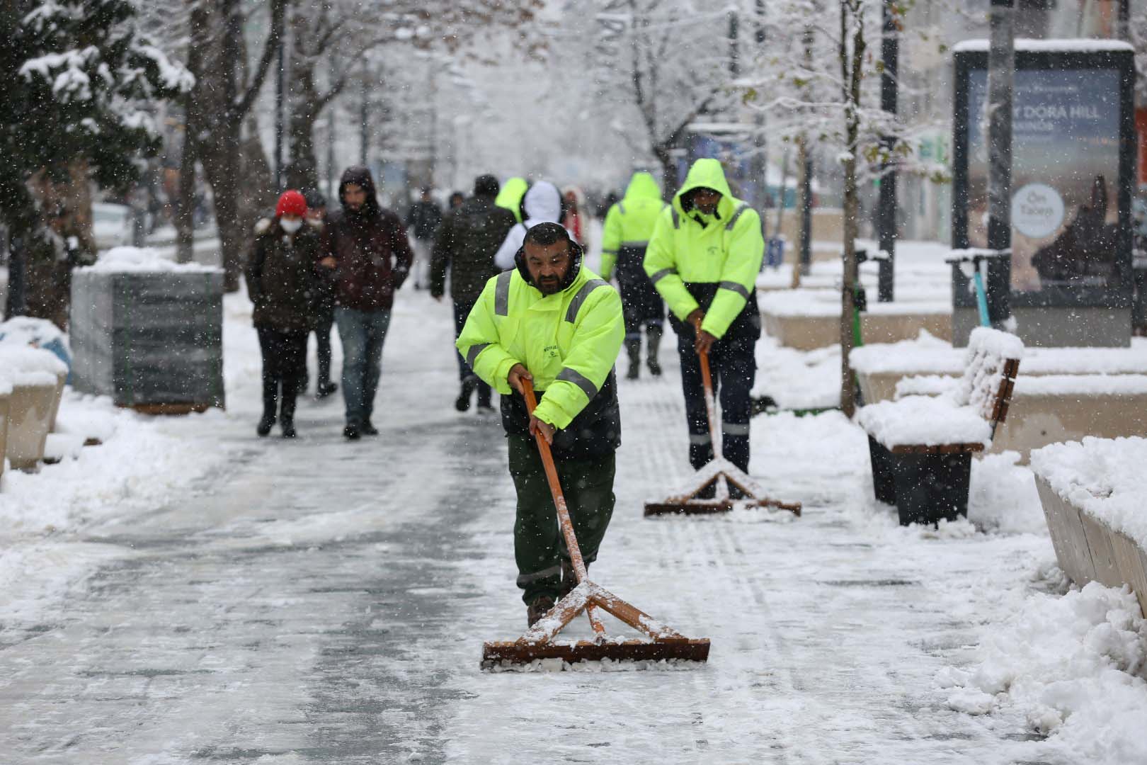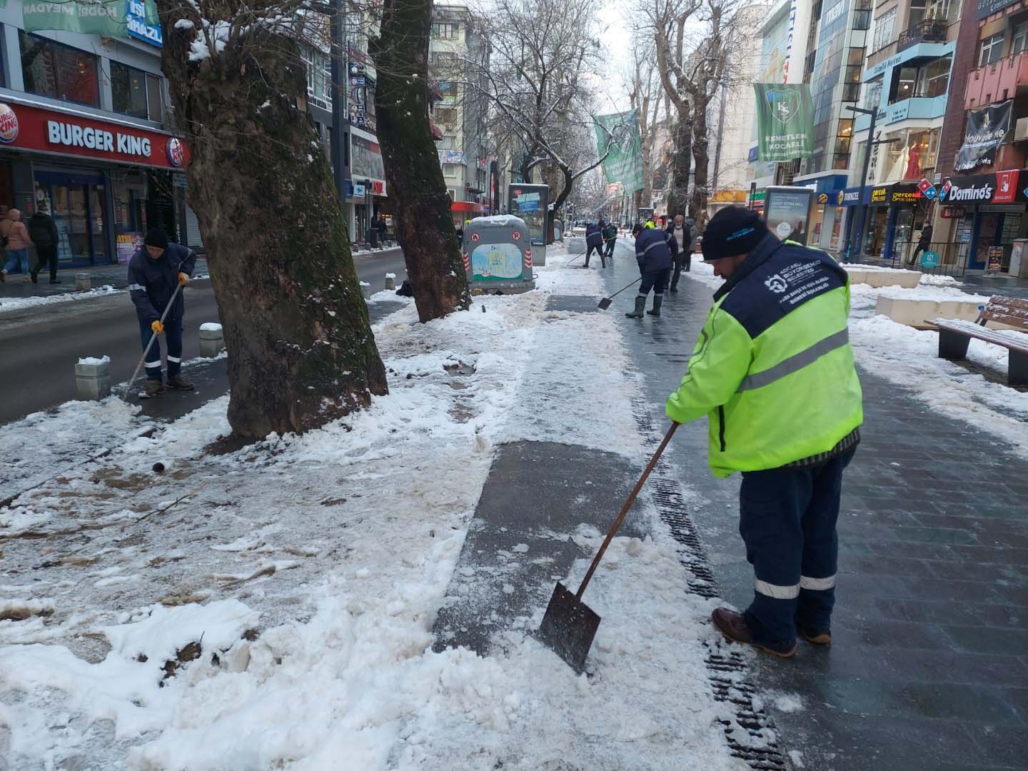 Soğuk ve yağışlı havanın yanı sıra yaşanabilecek don olaylarında vatandaşların güvenliğini sağlamak amacıyla tüm ekipleriyle sahada olan Büyükşehir, yeni haftaya da kar mesaisi yaparak başladı. Park ve Bahçeler Dairesi Başkanlığı ekipleri, geceden başlayan çalışmalarına sabah erken saatlerde de devam ederken, yoğun olarak kullanılan yaya üst geçitleri, merdivenler ve otobüs duraklarında solüsyon ve temizleme faaliyetlerine devam etti. Ekipler, yürüyüş yolu gibi vatandaşların çok yoğun kullandığı alanlarda ve cami önlerinde kaldırım temizliği de yaptı.