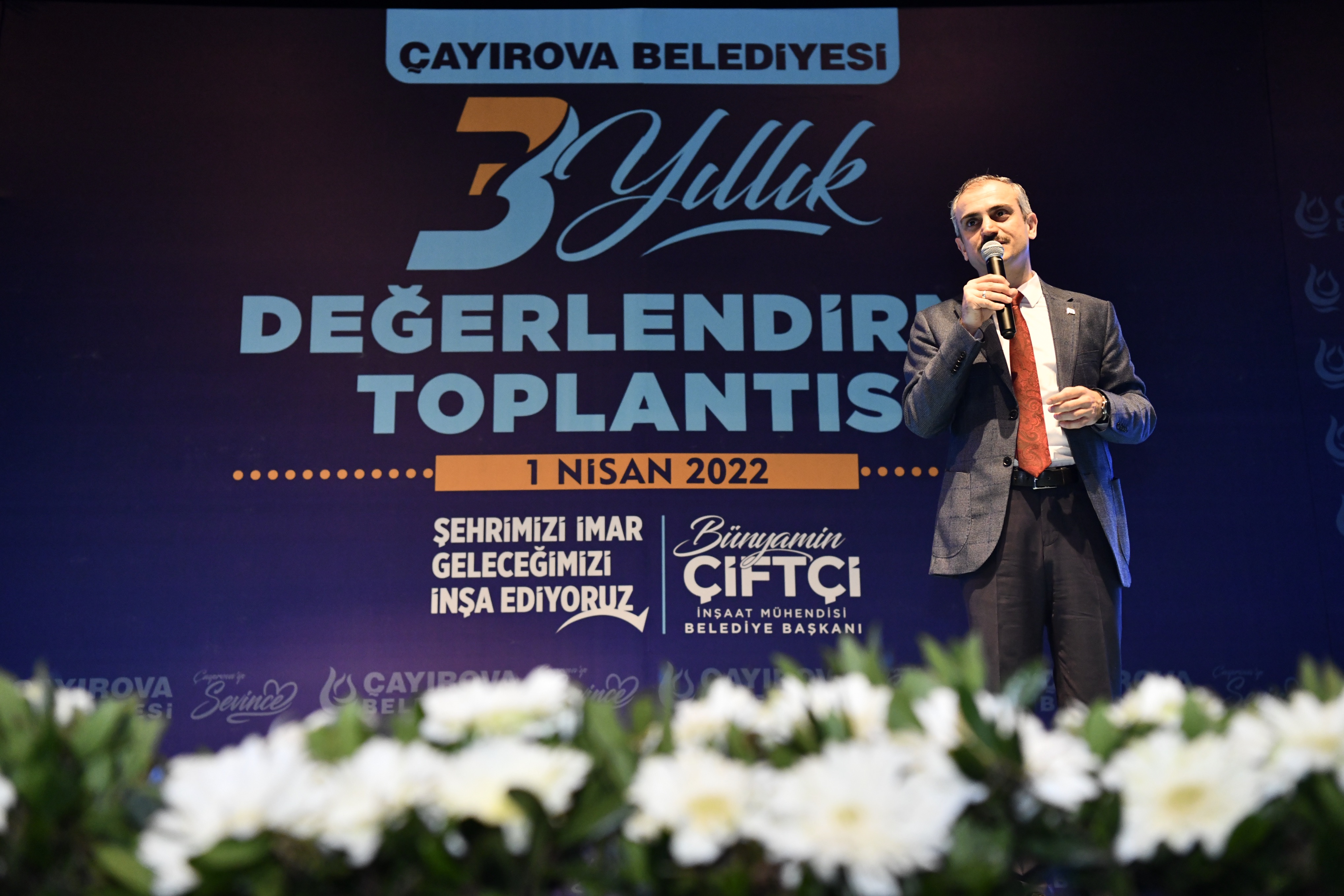 Çayırova Belediye Başkanı Bünyamin Çiftçi, 3 yılı anlatan sinevizyon gösterimi sonrasında konuşmasını yapmak üzere kürsüye davet edildi. Başkan Çiftçi konuşmasında,” 3 sene önce milletimizin teveccühü ve Cumhurbaşkanımız Recep Tayyip Erdoğan’ın tensipleriyle güzel bir seçim çalışmasının sonunda Çayırova tarihinin en yüksek oy oranı ile Kocaeli’de ilk 3’ e girerek göreve geldik. Şehre değer katan, kimlik kazandıran projelere öncelik verdik. Hem şehrimizi geleceğe hazırlamak hem de kısa, orta ve uzun vadeli planlarımızı hazırladık. Şehrimizin olmazsa olmazı olacak eserleri başlattık” dedi.