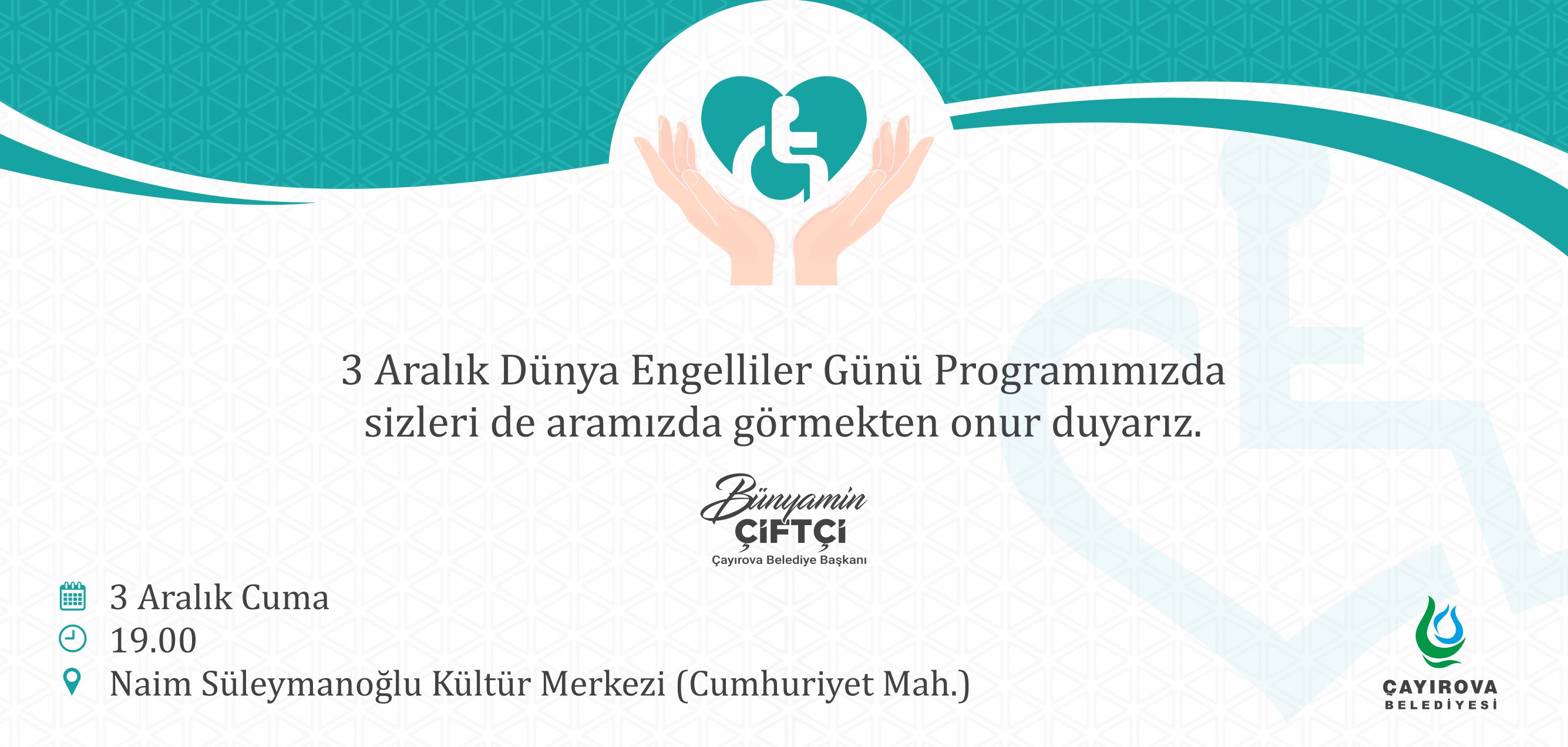 Çayırova Belediyesi 3 Aralık Dünya Engelliler Günü dolayısıyla bir program düzenledi. Çayırova’da yaşayan engellilerin her daim yanında ve destekçisi olan Çayırova Belediyesi, Dünya Engelliler Gününde ilçede yaşayan engelli vatandaşlar ve ailelerine yönelik özel bir program düzenledi. Çayırova Belediye Başkanı Bünyamin Çiftçi, Naim Süleymanoğlu Kültür Merkezinde engelli vatandaşlar ve aileleriyle bir araya gelerek birlikte akşam yemeği yiyecek. Başkan Çiftçi’nin günün anlamı ile ilgili konuşmasının ardından çeşitli etkinlikler gerçekleşecek.