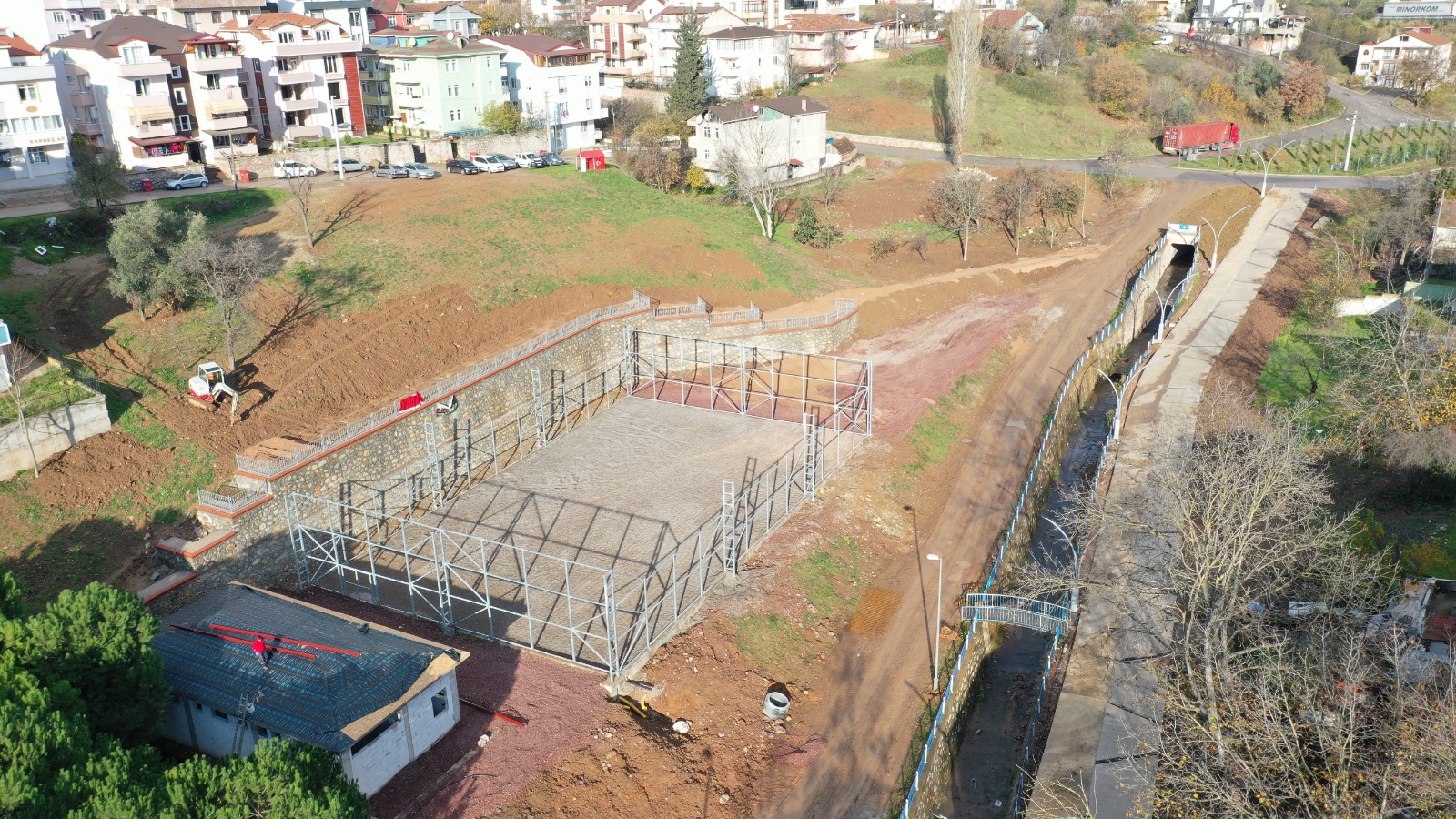 Proje kapsamında 21x35 ebadındaki futbol sahasının çelik, drenaj, mıcır dolgu, taş duvar işleri ile çelik imalatları bitirilirken sahanın zemin işlerine devam ediliyor. Kaba inşaat çalışmaları bitirilen sosyal tesis binasının duvar ve çatı imalatlarıyla ince işçilikler yapılıyor.