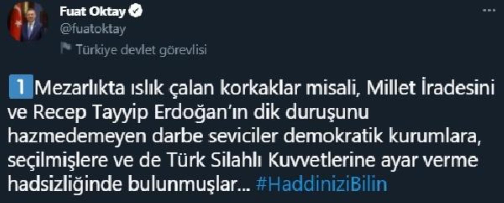 Cumhurbaşkanı Yardımcısı Fuat Oktay, Twitter'dan yaptığı açıklamada şunları kaydetti: "Mezarlıkta ıslık çalan korkaklar misali, Millet İradesini ve Recep Tayyip Erdoğan’ın dik duruşunu hazmedemeyen darbe seviciler demokratik kurumlara, seçilmişlere ve de Türk Silahlı Kuvvetlerine ayar verme hadsizliğinde bulunmuşlar... Haddinizi bilin.