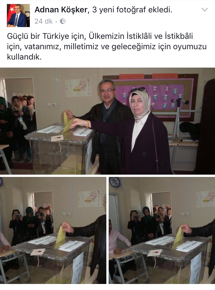 Başkan Köşker Oyunu KullandıGebze Belediye Başkanı Adnan Köşker oyunu kullandı 16 Nisan 2017 Pazar 11:48 Halk oylamasında oyunu Osman Yılmaz Mahallesi’nde sandık başına giderek Özel Gebze Koleji’nde kurulan 1291 nolu sandıkta oyunu kullandı. Facebook'ta Paylaş Tweetle Google+ Paylaş