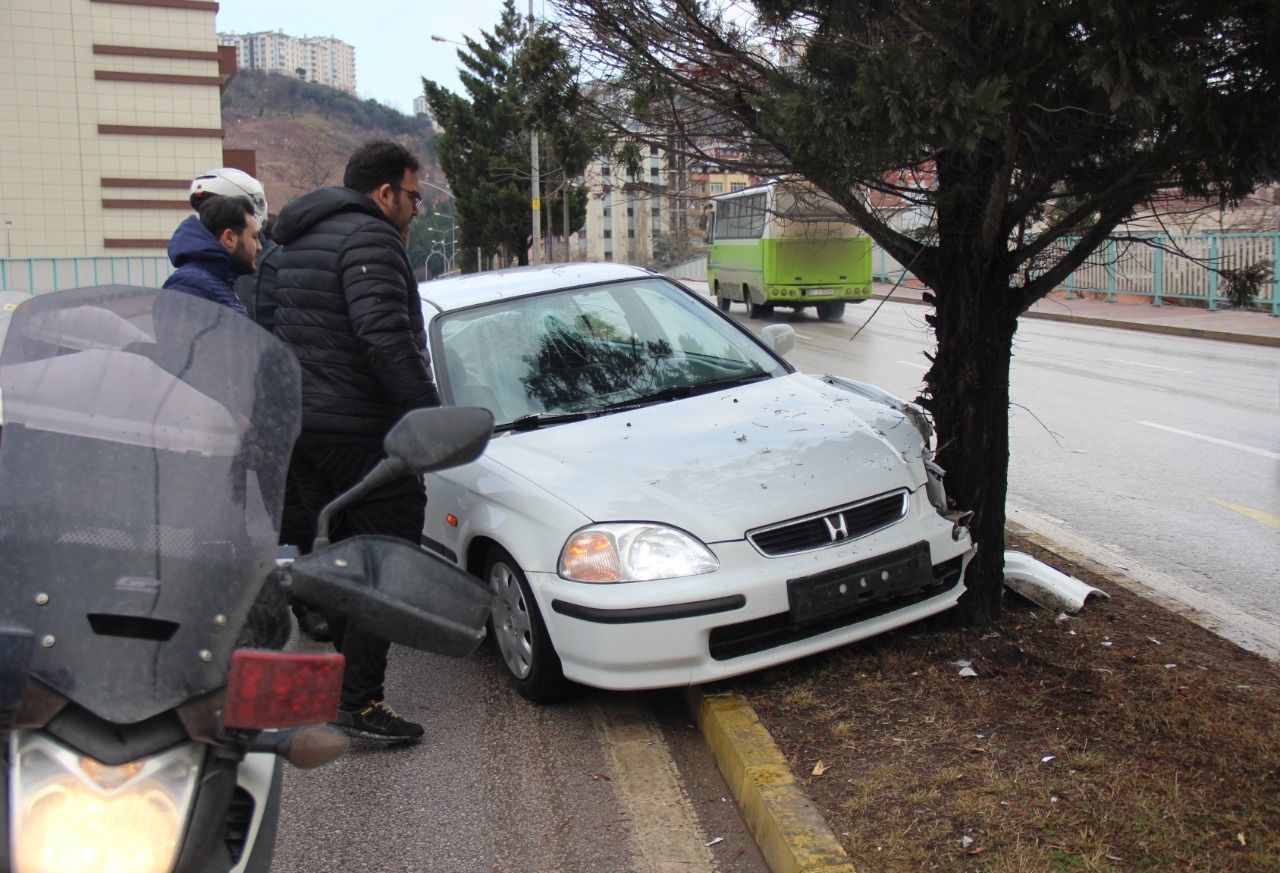 Otomobil, sürücüsünün direksiyon hakimiyetini kaybetmesiyle yol kenarındaki ağaca çarptı. Kazada sürücü ve otomobilde yolcu olarak bulunan kadın yaralandı.