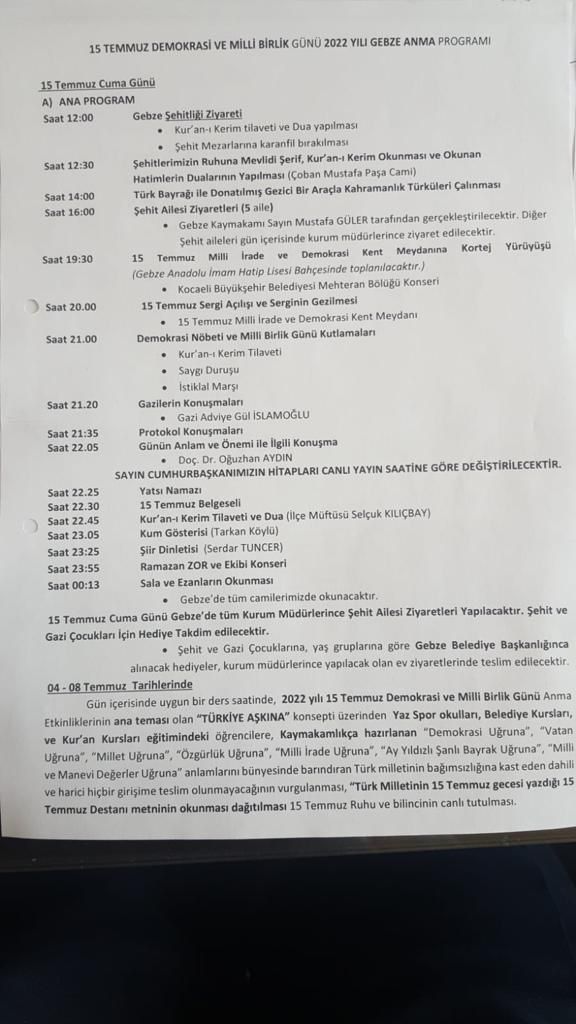 Gebze de 15 Temmuz EtkinliğiGebze belediyesi 15 Temmuz Demokrasi ve Milli Birlik Günü Etkinliği Programını açıkladı. 13 Temmuz 2022 Çarşamba 19:32 15 Temmuz hain darbe girişimin yıl dönümü dolayısı İle tüm Türkiye genelinde olduğu gibi gebze de önemli etkinlikler düzenleyecek Belediye bsşkanı Zinnur Büyükgöz tüm Gebzelileri 15 Temmuz cuma günü düzenlenen etkinliklere davet etti Facebook'ta Paylaş Tweetle Google+ Paylaş
