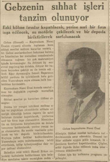 “Kaymakam Nami Ünalın riyaseti altında toplanan kaza sıhhat meclisi mühim kararlar vermiştir. Gebze asırlar-dan beri bakımsız kalmış ve İstanbulun bir mahallesi mesabesinde olmasına rağmen bir çok mahrumiyet içinde kıvranmıştır. Su ihtiyacı üç asır evvel yapılmış bir dolabla, ihtiyar bir katırın kuyudan çektiği su ile temin edilirdi. Eğer Ayvacıoğlu İsmail Başaranın bilfiil yardımı ile içilebilecek hale getirilen Yumrukaya suyu olmasa halk hastalıktan kırılacaktı. Kaymakam Nami Ünal kazada unutulmaz bir değişiklik yapmağa muvaffak olmuştur. Sıhhat meclisi şu kararları ittihaz etmiştir: