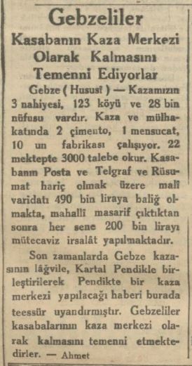 “Kazamızın 3 nahiyesi, 123 köyü ve 28 bin nüfusu vardır. Kaza ve mülhakatında 2 çimento, 1 mensucat, 10 un fabrikası çalışıyor. Kasabanın Posta ve Telgraf ve Rüsumat hariç olmak üzere mali varidatı 490 bin liraya baliğ olmakta, mahalli masarif çıktıktan sonra her sene 200 bin lirayı mütecaviz irsalat yapılmaktadır. Son zamanlarda Gebze kazasının lağvie, Kartal Pendikle birleştirilerek Pendikte bir kaza merkezi yapılacağı haberi burada teessür uyandırmıştır. Gebzeliler kasabalarının kaza merkezi olarak kalmasını temenni etmektedirler. - Ahmet” (30 Mayıs 1934 Son Posta Gazetesi)