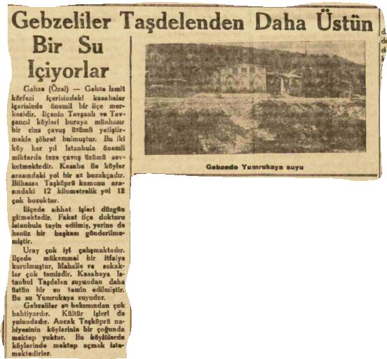 1935 yılında, İzmit Körfezi’ndeki önemli ilçelerden biri olduğu yazılan Gebze’nin Tavşanlı ve Tavşancıl’ın meşhur çavuş üzümlerinden ve yukarıdaki habere de konu olan Yumrukaya suyundan bahsedilmektedir. 1938 tarihli haberde bakımsız bir kasaba olarak bahsedilmişken, üç sene öncesindeki haberde mahalle ve sokakların çok temiz olduğu yazılmıştır!