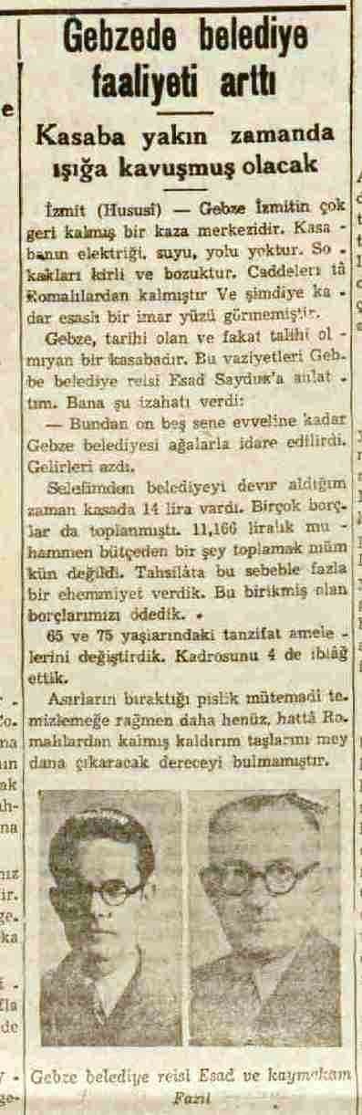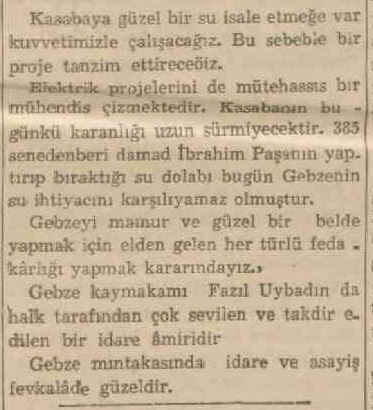 1938 yılındaki haberde, Gebze için yapılan kalkınma programı ve sağlık işleri başta olmak üzere yapılacak düzenlemelerden bahsedilmekte. Ayvacıoğlu İsmail Başaran’ın yardımı ile içilebilecek hale getirilen Yumrukaya suyu, kötü durumdaki fırınların kapatılacak olmasına ve evlerdeki kafeslerin kaldırılmasıyla ilgili çalışmalara yer verilmiş. Dönemin Kaymakamı Nami Ünal’ın başarılı çalışmalarından bahsedilmiş.