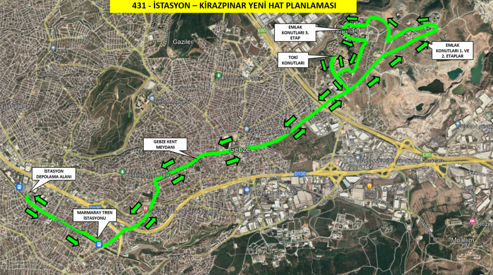 Kocaeli Büyükşehir Belediyesi, 02 Aralık tarihinden itibaren 431 no’lu hatta seferlere başlıyor. Perşembe günü itibariyle Gebze Marmaray İstasyonu ve Kirazpınar Mahallesi arasında ekspres bir toplu taşıma hattı hizmet vermeye başlayacak. 431 no’lu hat Kirazpınar Mahallesi içerisinde Emlak Konutları 1., 2. ve 3. etap ile TOKİ konutlarına girerek vatandaşların Gebze ilçe merkezine daha hızlı bir şekilde ulaşımını sağlayacak.