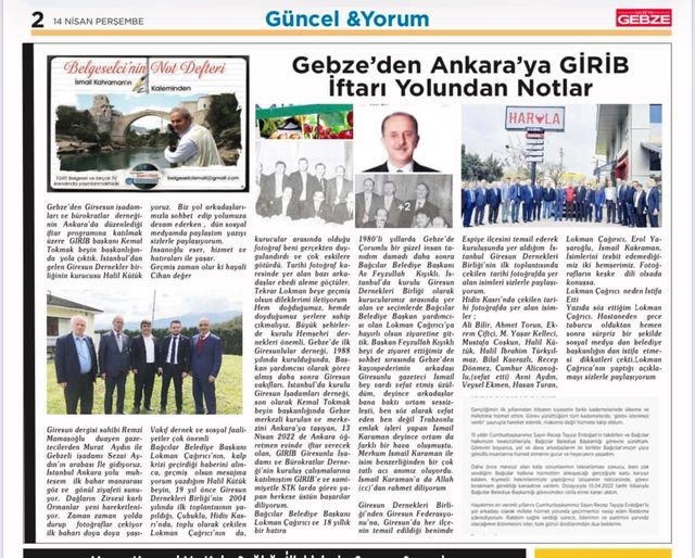 Hem doğduğumuz, hemde doyduğumuz yerlere sahip çıkmalıyız. Büyük şehirlerde kurulu Hemşehri dernekleri önemli. Gebze’de ilk Giresunlular derneği, 1988 yılında kurulduğunda, Başkan yardımcısı olarak görev almış daha sonra Giresun vakıfları, İstanbul’da kurulu Giresun İşadamları derneği, son olarak Kemal Tokmak beyin başkanlığında Gebze merkezli kurulan ve merkezini Ankara’ya taşıyan, 13 Nisan 2022 de Ankara öğretmen evinde iftar verecek olan, GİRİB Giresunlu İşadamı ve Bürokratlar Derneği’nin kuruluş çalışmalarına katılmıştım GİRİB’e ve samimiyetle STK larda görev yapan herkese üstün başarılar diliyorum.