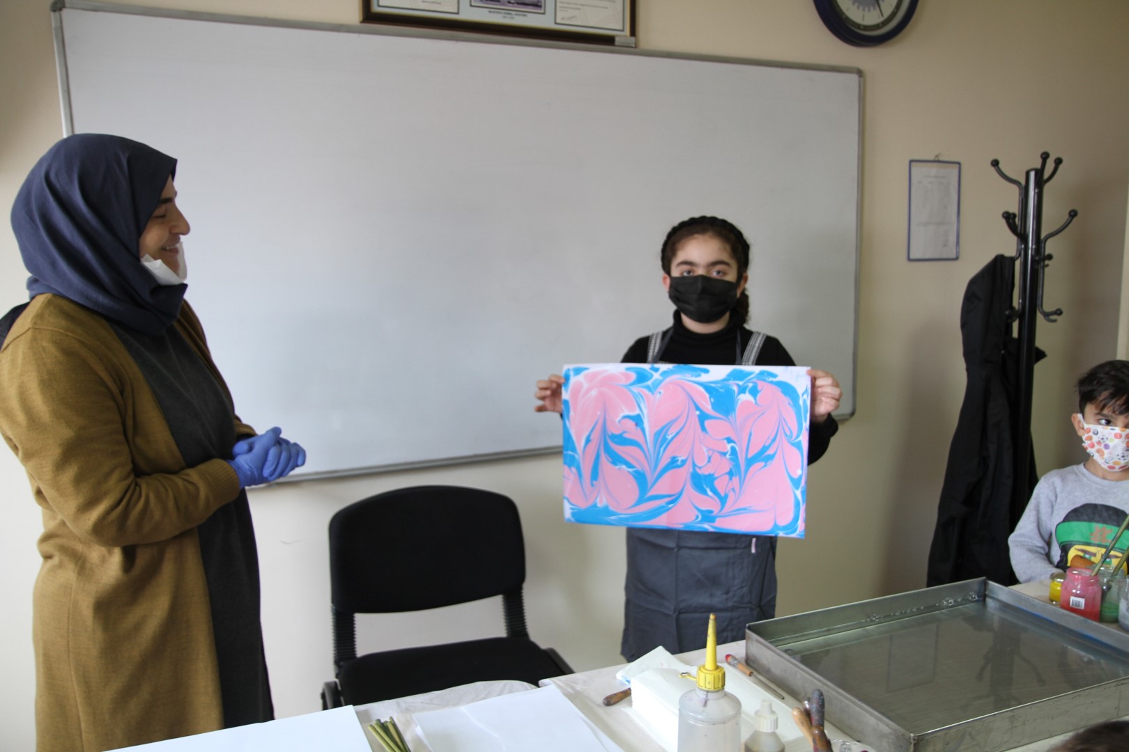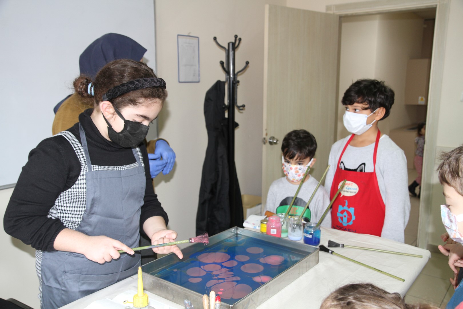 Keyifli anlara sahne olan etkinliklerde unutulmaya yüz tutmuş ebru sanatı da Gebzeli minik ellerde hayat buluyor. Bu bağlamda Büyükşehir, ebru sanatını gelecek nesillere aktarmak için Gebze bölgesinde bulunan öğrencilere ebru sanatını tanıtıyor. Hayatlarında ilk kez ebru sanatı ile tanışan öğrenciler, KO-MEK Kurs Merkezi’nde usta öğretici Gülseher Kahraman ile ebru yapmanın heyecanını yaşadı. Ebru sanatının tüm inceliklerini öğrenme hevesinde olan öğrenciler, keyifli geçen ilk gün etkinliğinde, seçtikleri renkler ve su üzerine oluşturdukları desenlerle kağıda hayallerini yansıttı. 28 Ocak’a kadar devam edecek olan etkinliklerden, 7-13 yaş arasındaki çocuklar yararlanacak.