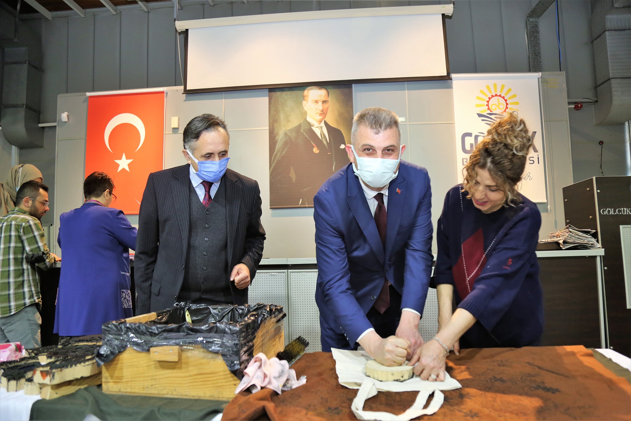 Etkinlikte Taş Baskı ve Oyma Ustası Yasemin Ertaştan’tan sanat hakkında bilgiler edinen Gölcük Belediye Başkanı Ali Yıldırım Sezer, öğrendiği bilgilerle taş baskılı çanta yaptı. Geleneksel sanatları yaşatmada gelecek nesle önemli bir görev düştüğünü belirten Başkan Sezer, “Taş Baskı ve Oyma Ustası Yasemin Ertaştan başta olmak üzere bu tarihsel sanatımızı en iyi şekilde öğrenerek hem yapmaya devam edeceklerini hem de arkadaşlarına öğreteceklerini düşündüğüm öğrencilerimizi birbirinden güzel yaptıkları taş baskı ürünler için tebrik ederim” dedi.