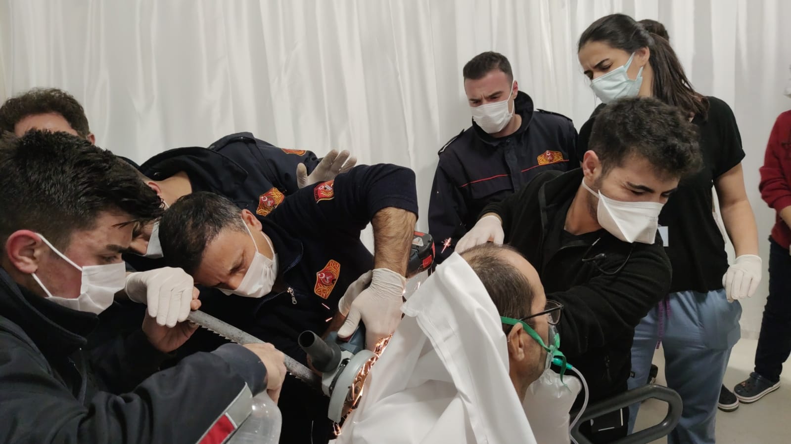 Sağlık personeli, Akyol'un sırtındaki testerenin çıkarılması için itfaiye ekibinden yardım istedi.