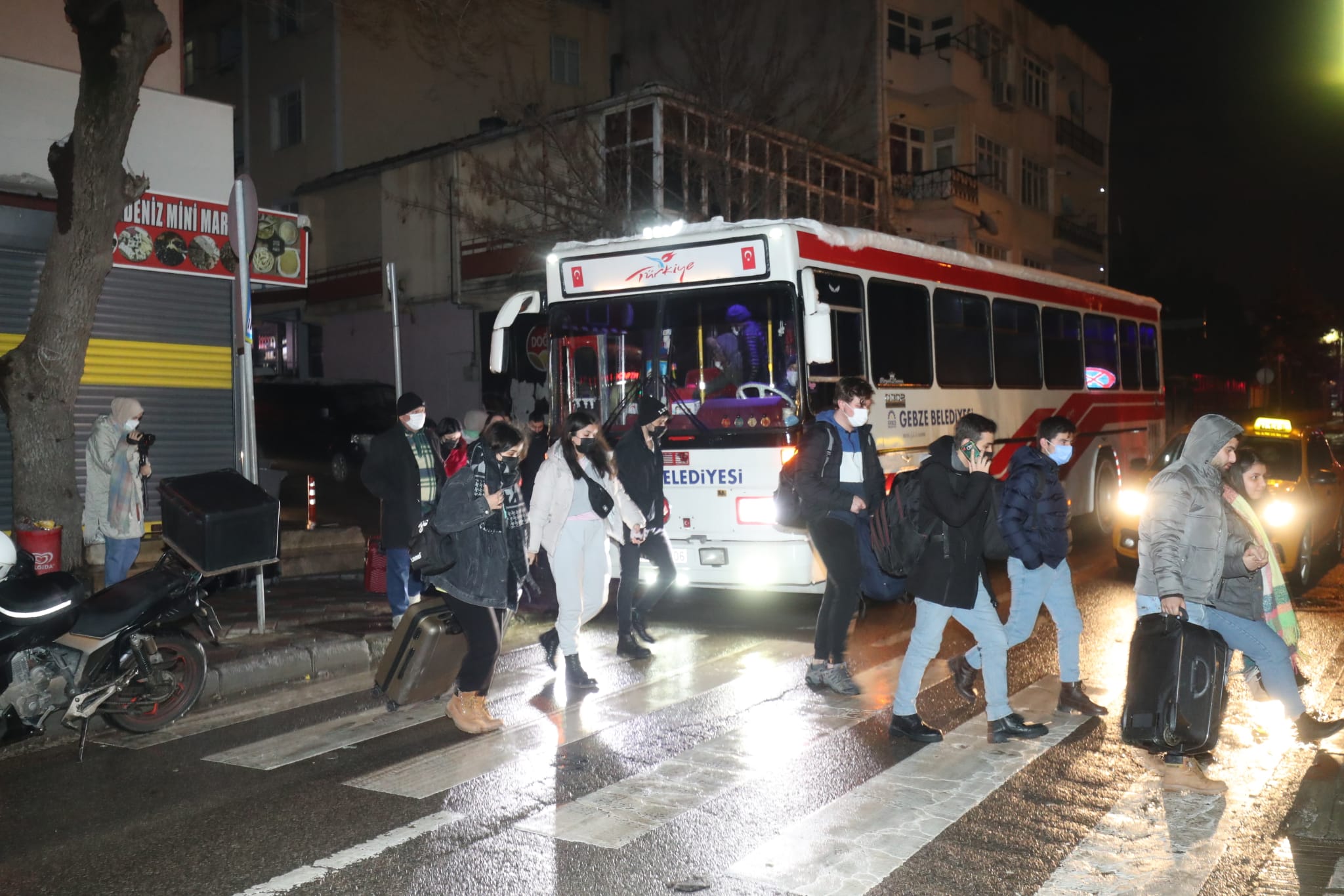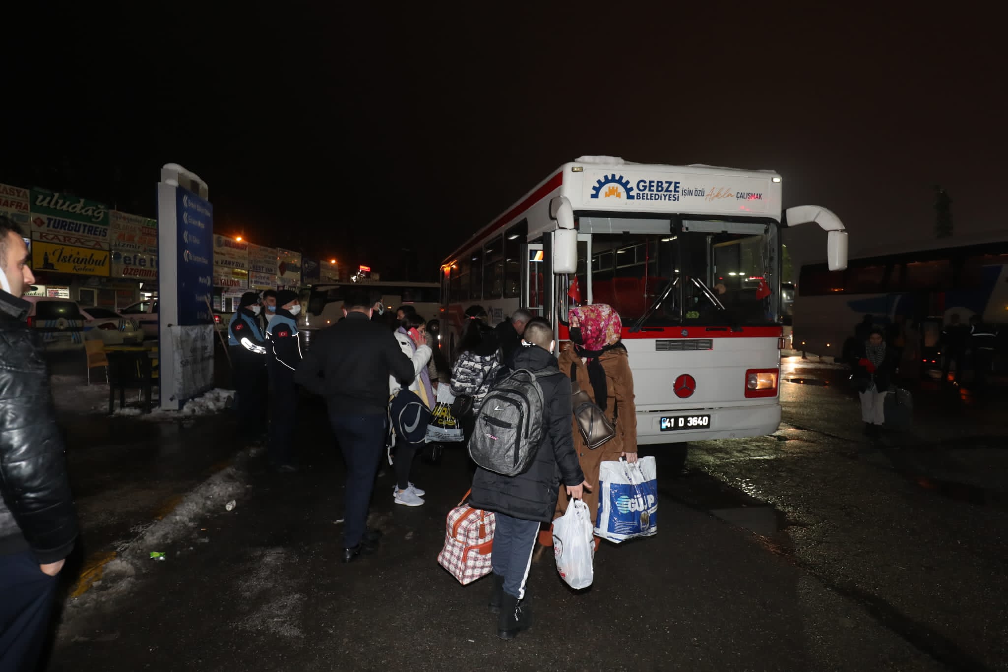 Anadolu’nun farklı illerinden seyahat firmalarıyla yolculuk yapan ve kar yağışı nedeniyle Gebze’de indirilen yolcuların yardımına Gebze Belediye yetişti. Kocaeli Büyükşehir Belediyesi ile birlikte işbirliği içerisinde çalışma yürüten Gebze Belediyesi ekipleri tarafından vatandaşlar; İstanbul’da bulunan ikametlerine güven içerisinde varabilmeleri için otobüsler aracılığıyla Marmaray Gebze istasyonuna taşındı. Geceyi Gebze’de ikamet ederek geçirecek yolcuların da güven içerisinde konaklama tesislerine ulaştırılmasını da sağlayan Gebze Belediyesi’nin çalışmalarını yerinde yakından takip eden Belediye Başkanı Zinnur Büyükgöz, “Vatandaşlarımızın yanındayız. Vatandaşlarımızın İstanbul’da bulunan ikametlerine güven içerisinde gidebilmeleri için Marmaray istasyonuna sevkleri ekiplerimiz tarafından ivedi bir şekilde gerçekleştirildi. Ayrıca zabıta personellerimiz vasıtasıyla bu akşam ilçemizde ikamet edecek vatandaşlarımızın otellere ve konaklama tesislerine sevki için de gerekli desteği sürdürmekteyiz” ifadelerini kullandı