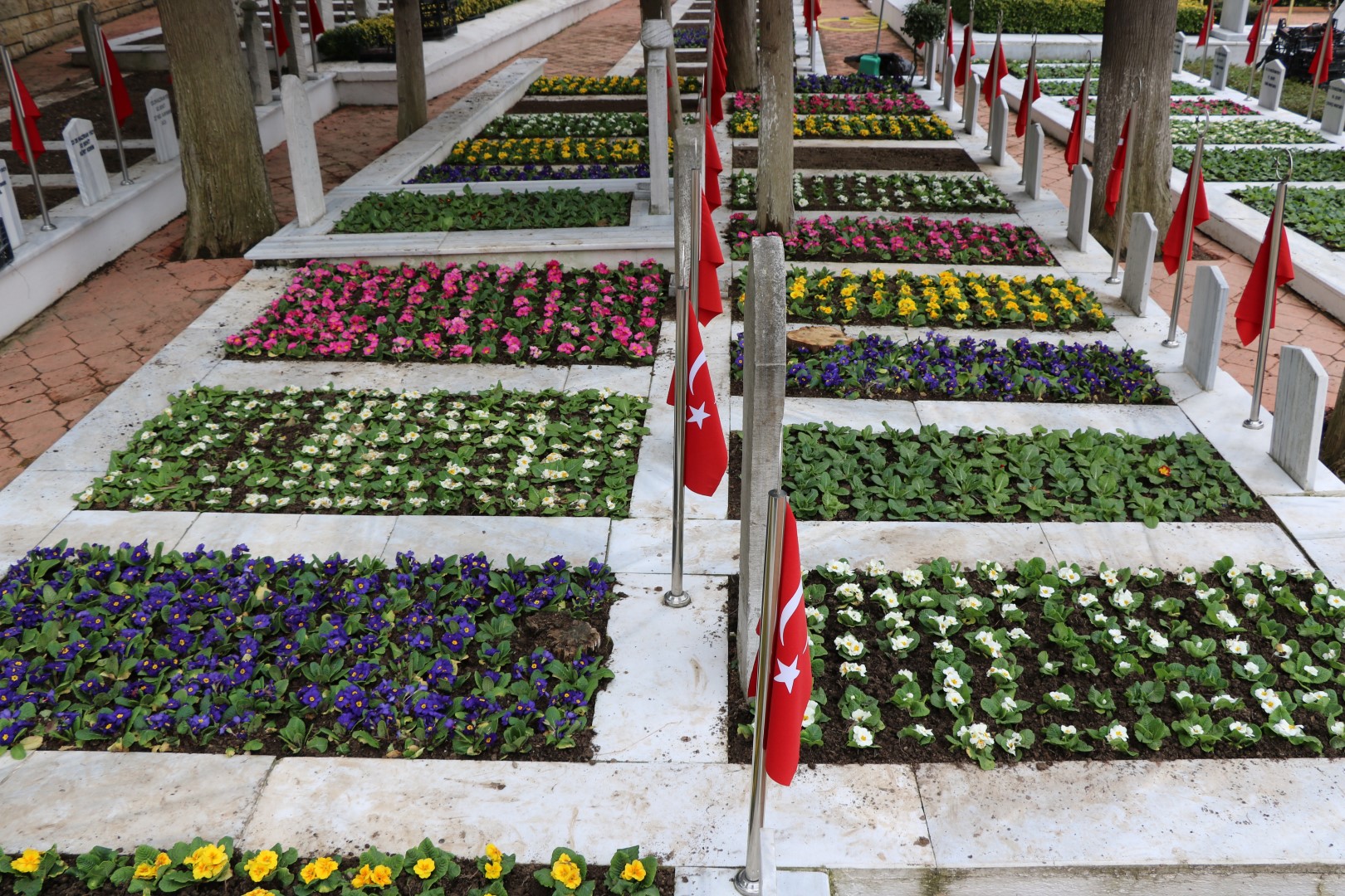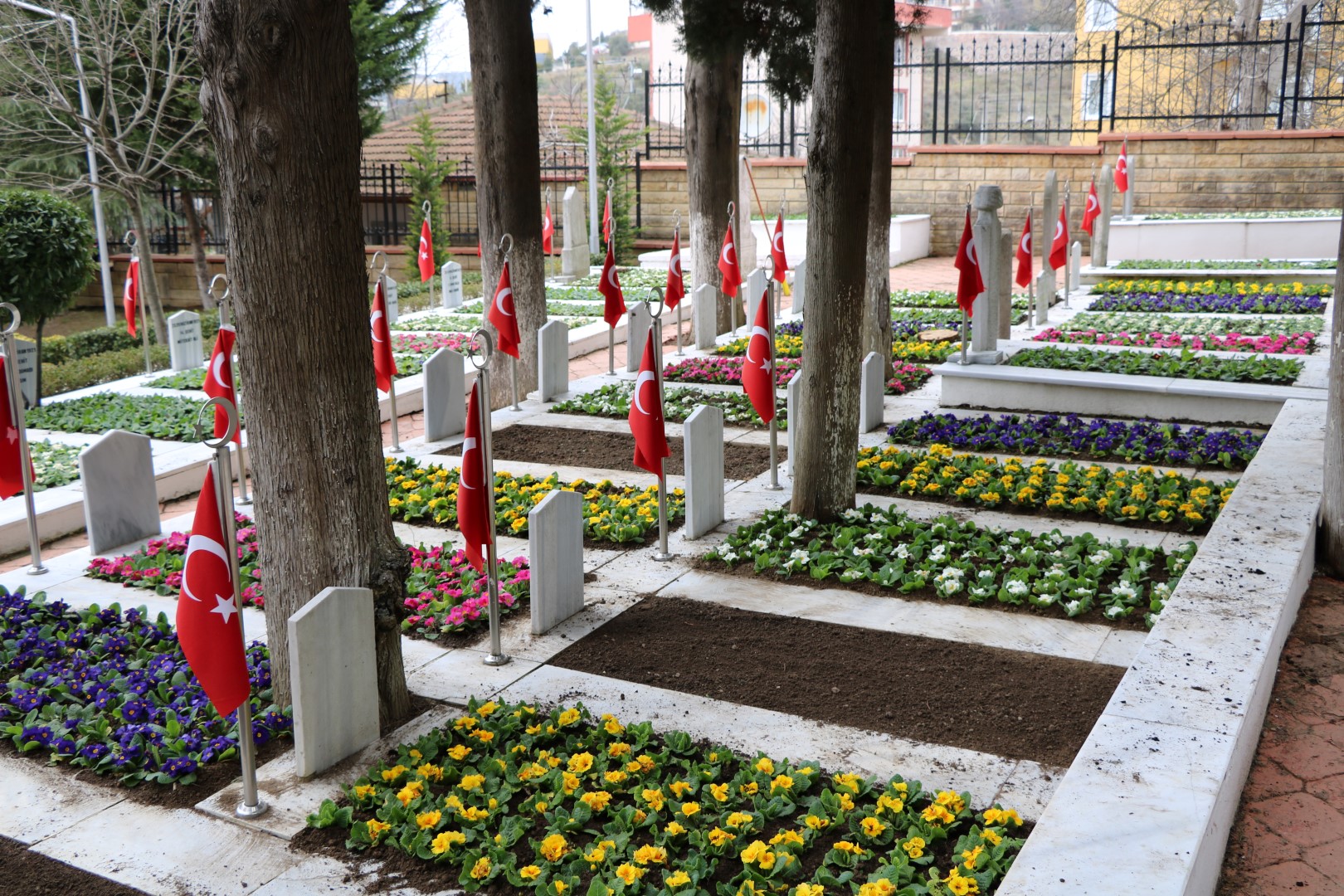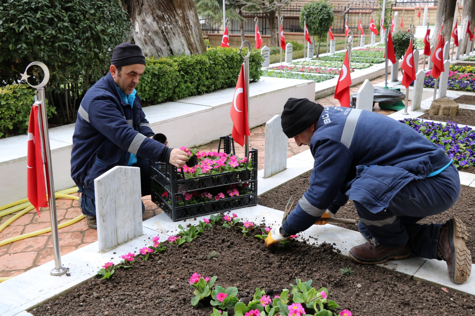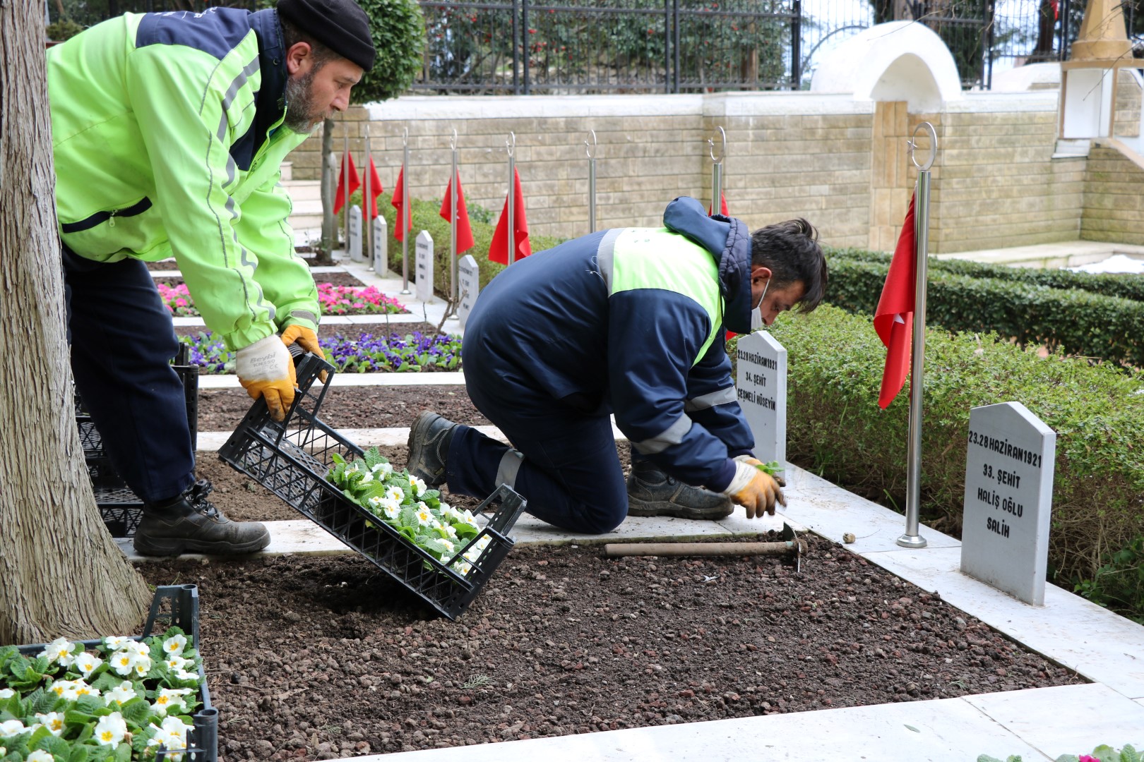Kocaeli genelinde tüm ilçelerimizde Büyükşehir Belediyesi Park Bahçeler Dairesi Başkanlığı Mezarlıklar Müdürlüğü ve ilçe belediyelerimiz ile koordineli olarak başlatılan çalışma ile Gebze’den Kartepe’ye, Karamürsel’den Kandıra’ya tüm ilçelerimizde bulunan şehit mezarlarımızın bakımları, çiçeklendirmeleri, mermerlerinin yenilenmesi düzenli olarak takip ediliyor ve en kısa sürede gerekli çalışmalar yapılıyor. Görevli ekipler büyük bir özenle şehit mezarlarımızı adeta çiçek bahçesine dönüştürüyor.
