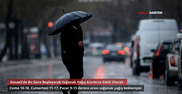 Kocaeli’de sağanak yağış bu gece itibarıyla başlayacak ve günlerce etkili olacak. Kentte hava durumu ise şöyle öngörülüyor: Cuma günü en düşük 10, en yüksek 18 derece sağanak yağışlı; Cumartesi en düşük 11, en yüksek 17 derece sağanak yağışlı; Pazar en düşük 9, en yüksek 15 derece sağanak yağışlı.