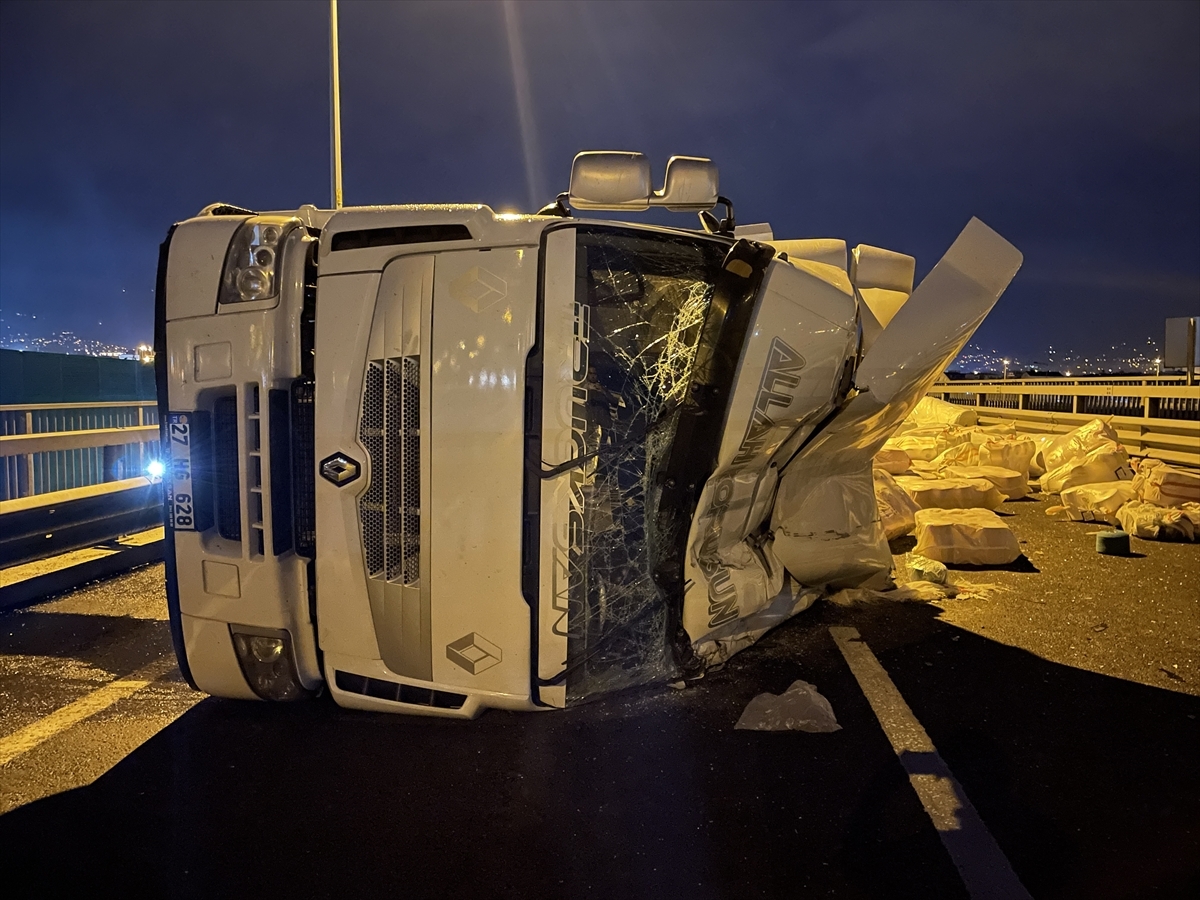 M.C. idaresindeki 27 HG 628 plakalı tır, otoyolun İzmit Doğu gişeleri bağlantı yolunda devrildi.