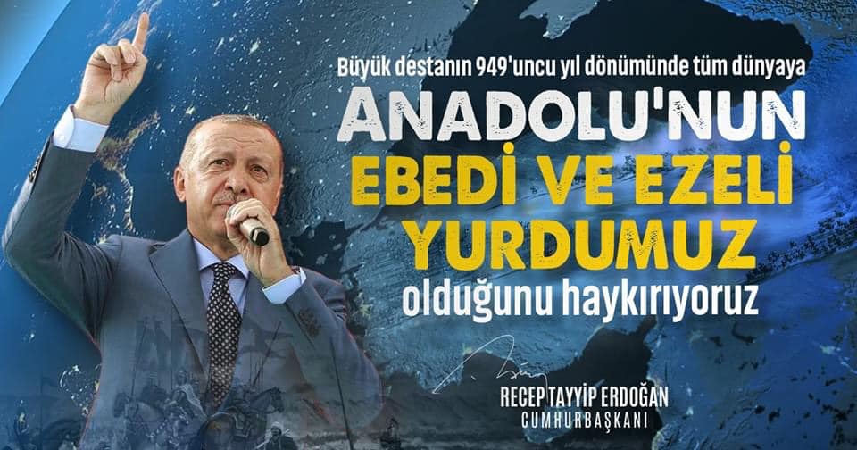 Cumhurbaşkanı Erdoğan, sosyal medya hesabından Malazgirt Zaferi'nin 949. yıl dönümü dolayısıyla paylaşımda bulundu.