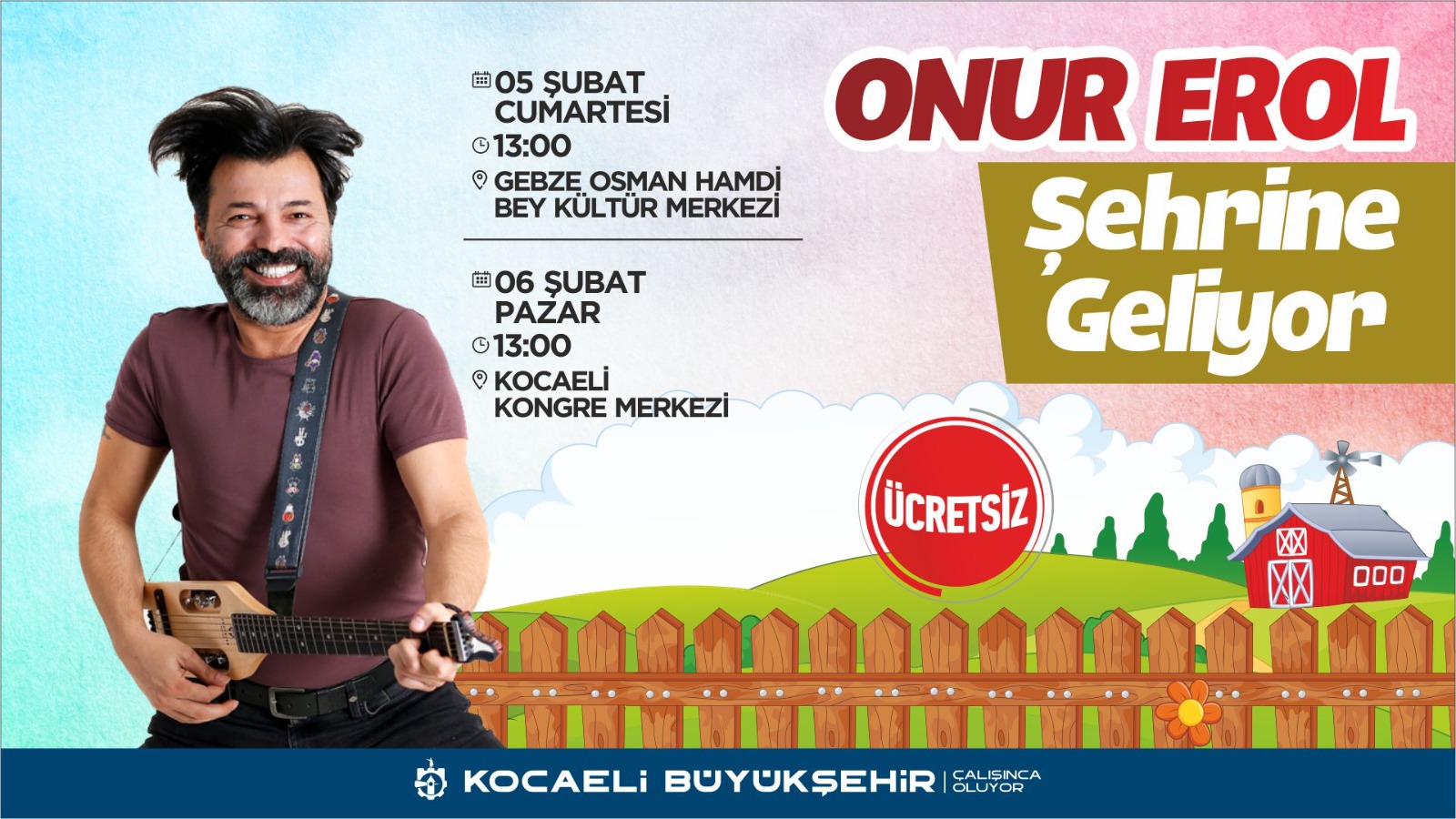 Kocaeli Büyükşehir Belediyesi’nin ara tatil etkinlikleri kapsamında gerçekleştireceğini duyurduğu ancak olumsuz hava şartları nedeniyle ertelenen Onur Erol konserleri bu hafta sonunda düzenlenecek. Çocukların çok sevdiği Onur Erol ilk olarak 05 Şubat Cumartesi günü Gebze Osman Hamdi Bey Kültür Merkezi’nde konser verecek. Sevilen sanatçı 06 Şubat Pazar günü de Kocaeli Kongre Merkezi’nde çocukların karşısında olacak. Her iki konser 13.00’te başlayacak. Ücretsiz konserlere tüm çocuklar katılabilecek. Çocuklar tatilin son hafta sonunda sevdikleri sanatçının şarkılarıyla eğlenerek ve enerji toplamış olarak okullarına dönecek.