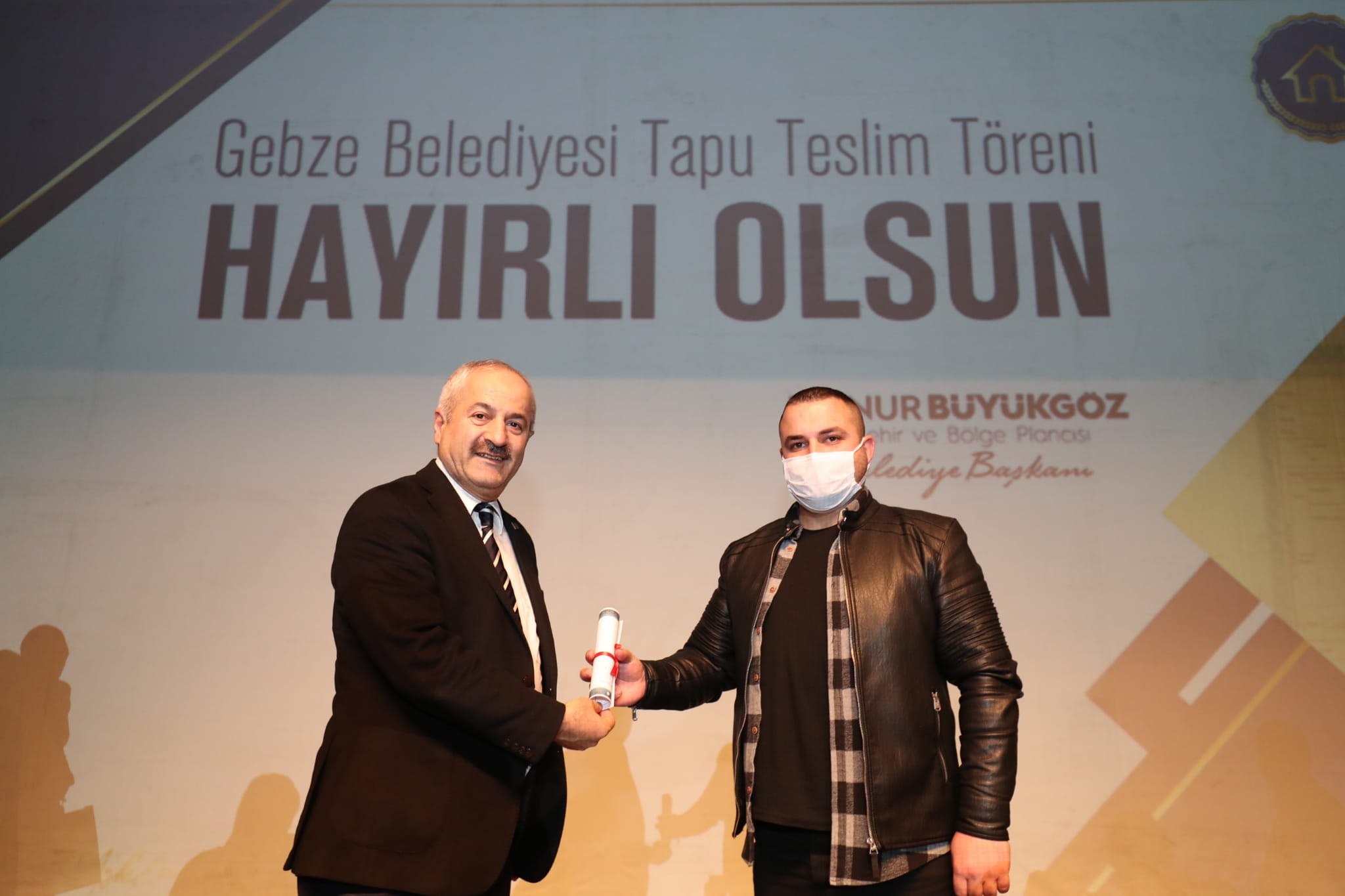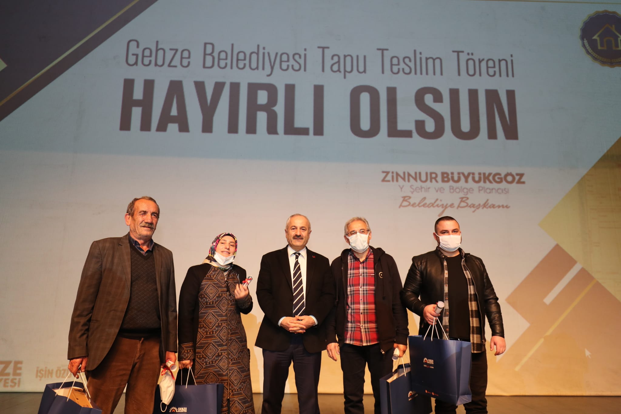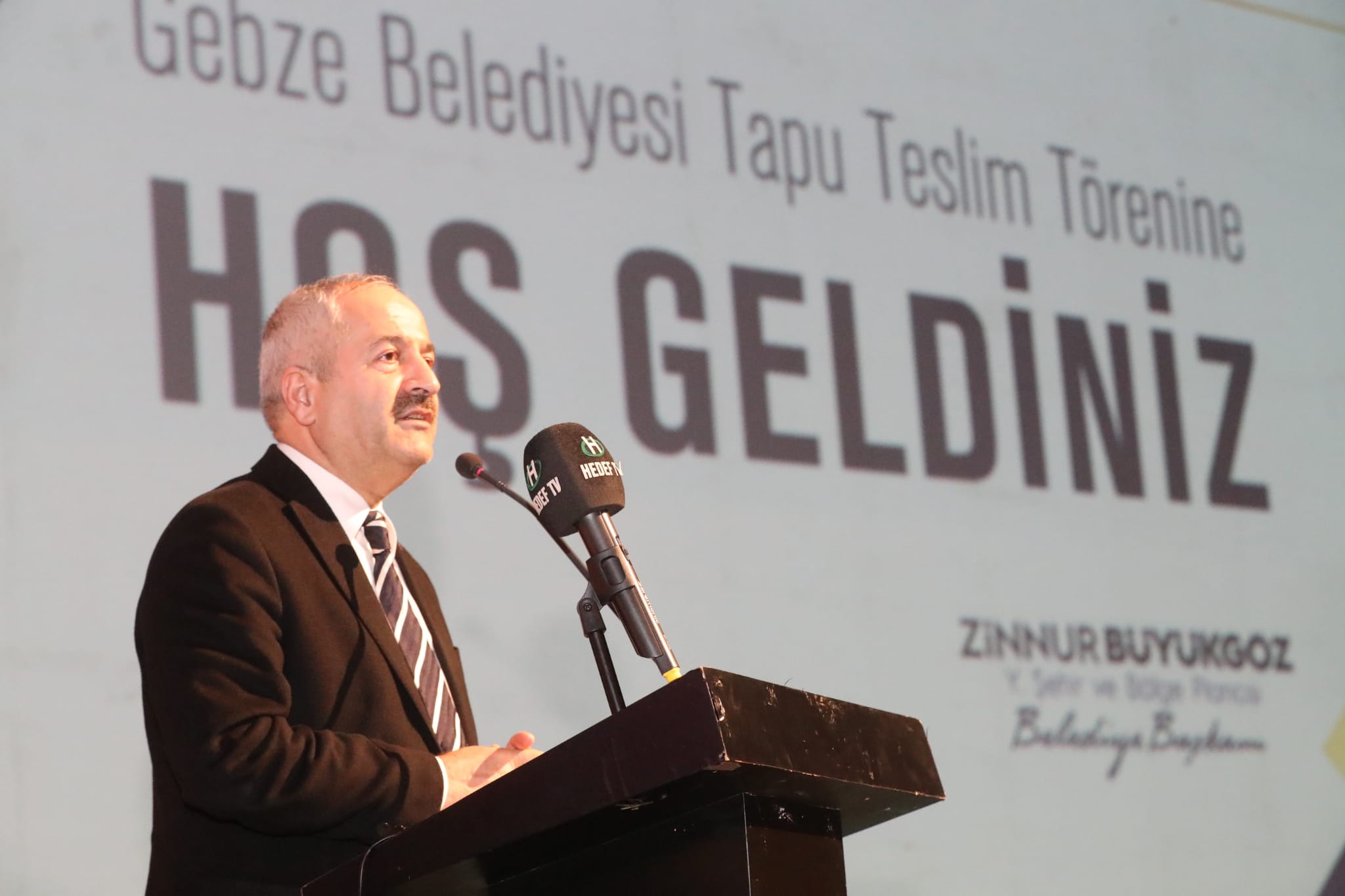 Tapu töreninde kısa bir selamlama konuşması yapan Gebze Belediye Başkanı Zinnur Büyükgöz, “Törenimize hoş geldiniz sefalar getirdiniz. 100 yıllık dönemde Gebze’de tamamlanan imar alanı, 6500 hektarlık alandı. 2 yılda bizim imar uygulaması tamamlayarak tapularını teslim ettiğimiz alan ise 4500 hektar. 2022 yılı sonuna kadar 1300 hektarlık alanı daha tamamlayıp toplamda 5800 hektarlık imar çalışmasını bitirmiş olacağız. Bu çalışmalarda emeği geçen mesai arkadaşlarıma ve tapu müdürlüğümüze teşekkürlerimi bir kez daha arz ediyorum. Hak sahiplerimizi bir kez daha tebrik ediyor hayırlı uğurlu olsun temennilerimi iletiyorum. Allah’a emanet olun” ifadelerini kullandı.
