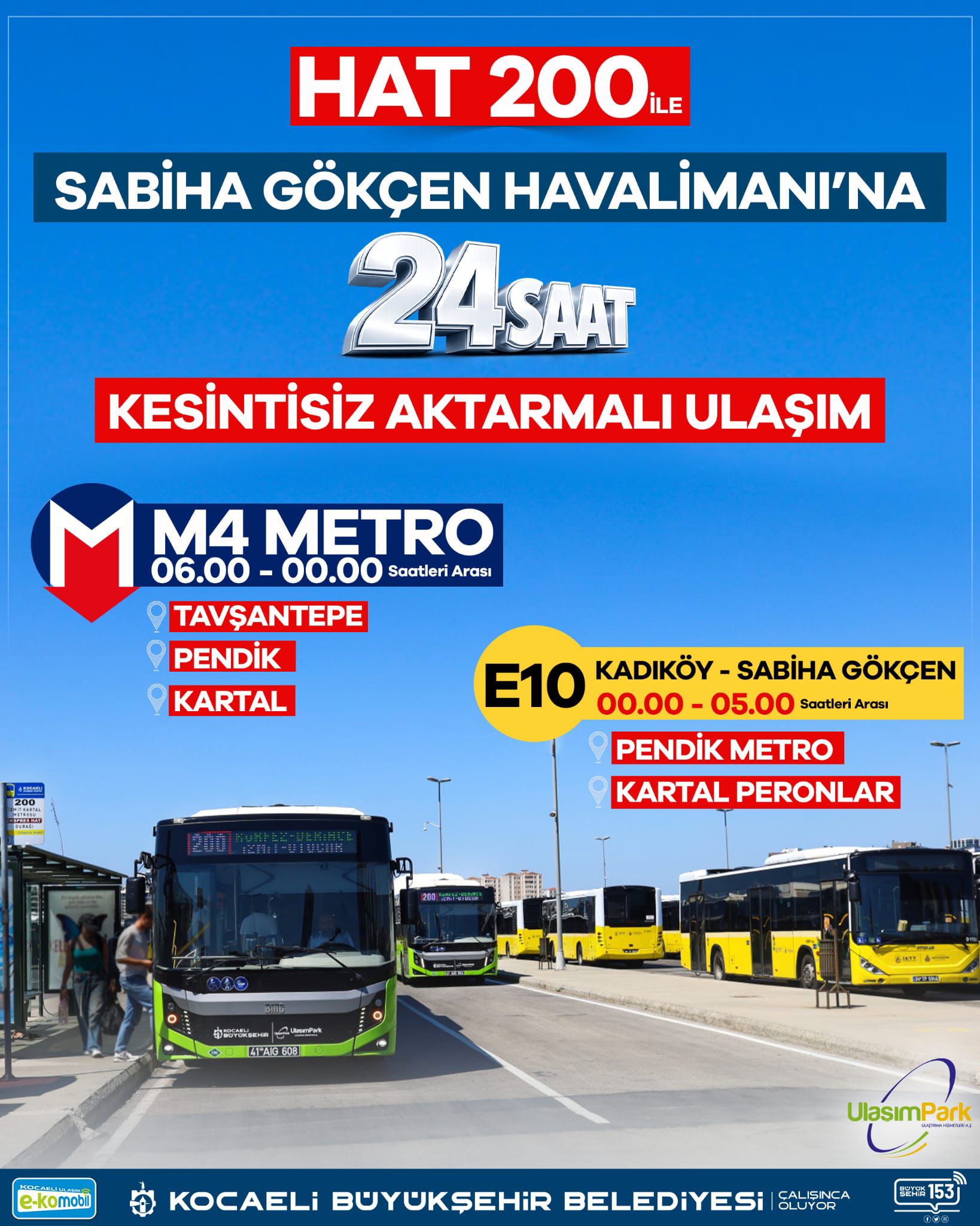 Kocaeli Büyükşehir Belediyesi, Hat 250’nin sona ermesinin ardından alternatif ulaşım planını devreye aldı. İzmit Otogar-Kartal güzergâhında hizmet veren Hat 200 ile artık havalimanına 24 saat kesintisiz erişim sağlanacak. Seferler, yolcu yoğunluğuna bağlı olarak 10 ila 60 dakika aralıklarla düzenlenecek. 06.00-00.00 saatleri arasında Hat 200 ile seyahat eden yolcular; Tavşantepe, Pendik veya Kartal duraklarında inerek M4 Metro Hattı’na aktarma yapabiliyor. Metro yolculuğu yaklaşık 12 dakika, otobüs yolculuğu ise ortalama 90 dakika sürüyor. Böylece toplam ulaşım süresi yaklaşık 102 dakika olarak gerçekleşiyor.