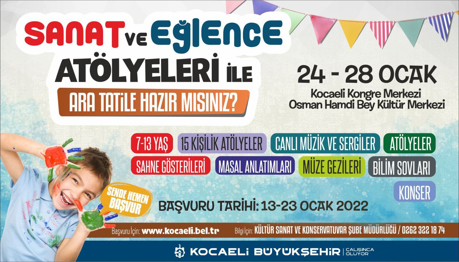 Kocaeli Büyükşehir Belediyesi, 24 Ocak-4 Şubat tarihleri arasında yapılacak 2022 Yarıyıl Tatilinin ilk bölümünde, çocukların tatil keyfine Sanat ve Eğlence Atölyeleri ile renk katacak. 24-28 Ocak tarihleri arasında gerçekleştirilecek etkinliklerden, 7-13 yaş arasındaki çocuklar yararlanacak. Etkinlikler için başvuru süresi 13 Ocak Perşembe günü başladı. Kurulacak atölyelerde Karagöz’den masala, ekmek pişirmekten şerbet yapımına, kukla yapımı gösterisinden konserlere kadar birbirinden farklı sanatsal aktiviteler düzenlenecek.