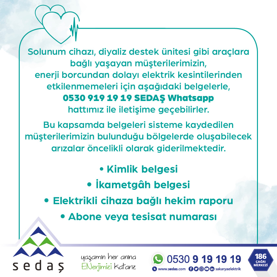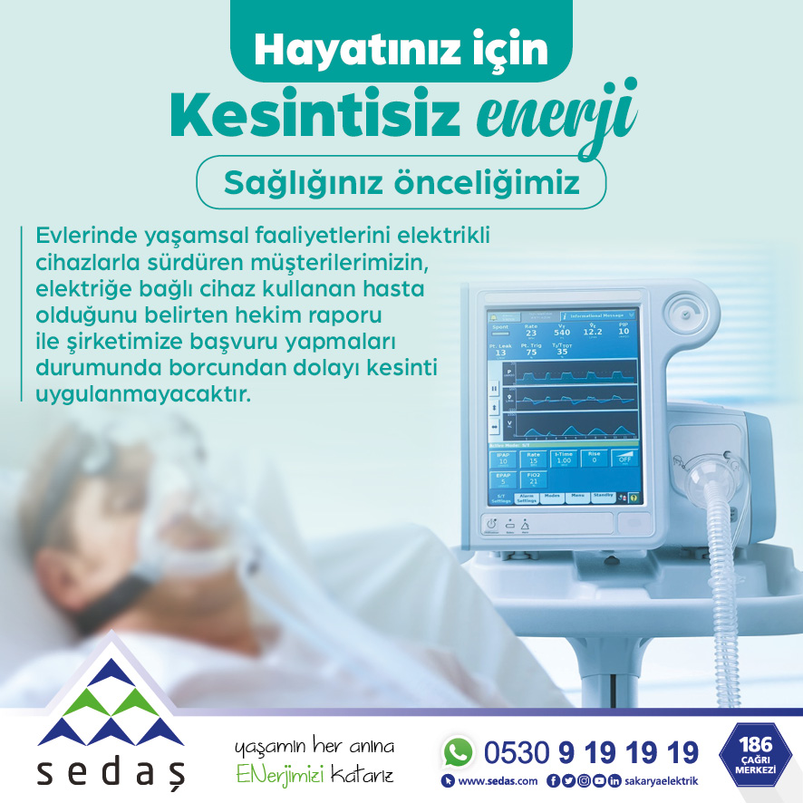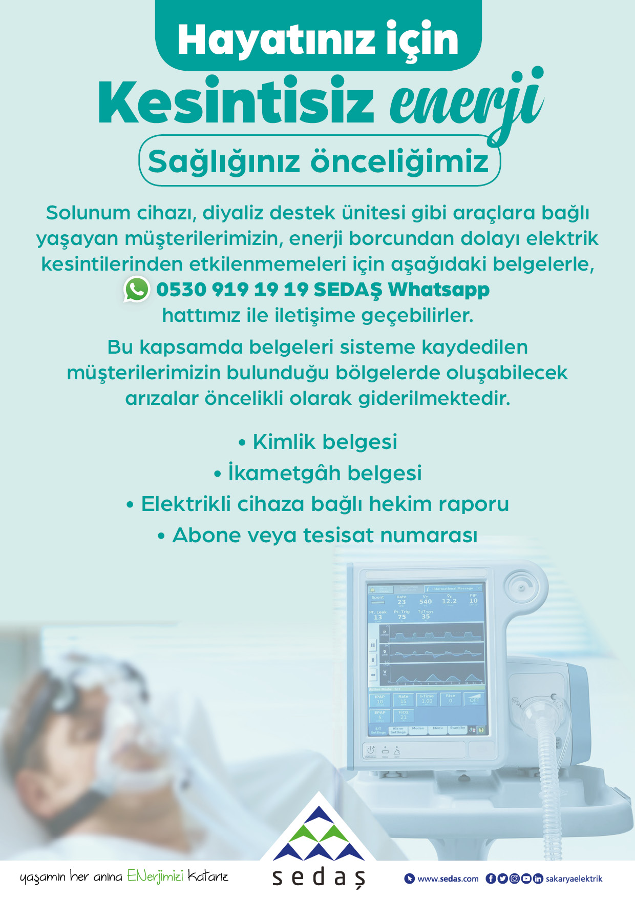 20 bin kilometrekarelik alandaki 3,8 milyon nüfusa hizmet veren Sakarya Elektrik Dağıtım A.Ş., elektrik kesintilerinden dolayı cihaza bağlı hastaların mağdur olmasının önüne geçecek. 4 İlin İl sağlık müdürlükleri ile iş birliği yapılarak yaşam destek ünitesinden yararlanan müşterilerin adresleri sisteme kaydedilecek.
