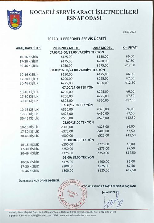 Kocaeli Servis Aracı İşletmecileri Odası Başkanı Şenol İkizek, yaptığı yazılı açıklamada yeni ücret tarifesini duyurdu. Artan maliyetler nedeniyle fiyatlarda değişikliğe gidildiğini belirten İkizek, 8 Mart tarihi itibariyle uygulamaya alınan yeni fiyat tarifesinin saatli sistemle hazırlandığının da altını çizdi. Saatli sistemin cari açıkta ve trafikteki servis sayısında azalma sağlayacağını belirten Başkan İkizek, yeni tarifeyle ilgili bilgi verdi. İkizek, “Bu zam kaçınılmazdı bizim için” dedi.