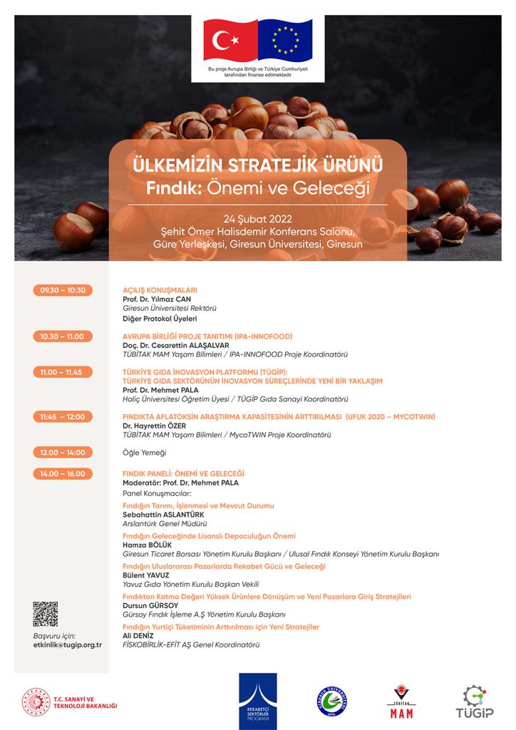 Giresun Üniversitesi Güre Yerleşkesinde gerçekleştirilecek etkinlik, Giresun Üniversitesi Rektörü Prof. Dr. Yılmaz CAN’ın açılış konuşmasıyla başlayıp, TÜBİTAK MAM Başkan Danışmanı, INNOFOOD Proje Koordinatörü Doç. Dr. Cesarettin Alaşalvar’ın “TÜBİTAK MAM (Marmara Araştırma Merkezi) Yaşam Bilimleri Gıda Araştırmaları ve INNOFOOD Projesi”nin tanıtımı ile devam edecek. Ardından TÜBİTAK MAM Yaşam Bilimleri Gıda Araştırmaları Başuzman Araştırmacı / MycoTWIN Proje Koordinatörü Dr. Hayrettin ÖZER “Fındıkta Aflatoksin Araştırma Kapasitesinin Artırılması” başlıklı sunum yapacak. Türkiye Gıda İnovasyon Platformu, TÜGİP ve sunulacak olanak ve hizmetler Haliç Üniversitesi Öğretim Üyesi ve TÜGİP Gıda Sanayi Koordinatörü Prof. Dr. Mehmet Pala tarafından ayrıntılı olarak anlatılacak.