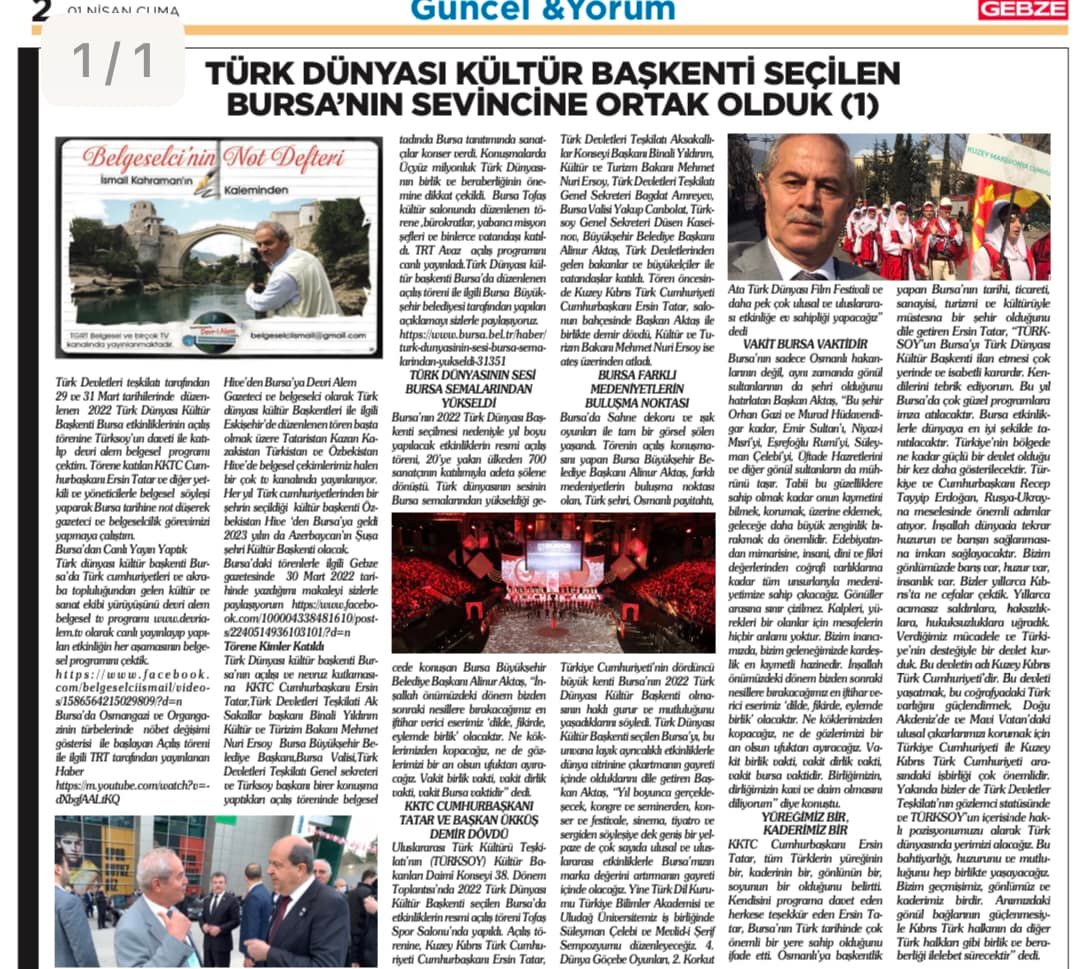 Türk Devletleri teşkilatı tarafından 29 ve 31 Mart tarihilerinde düzenlenen 2022 Türk Dünyası Kültür Başkenti Bursa etkinliklerinin açılış törenine Türksoy’un daveti ile katılıp devri alem belgesel programı çektim.Törene katılan KKTC Cumhurbaşkanı Ersin Tatar ve diğer yetkili ve yöneticilerle belgesel söyleşi yaparak Bursa tarihine not düşerek gazeteci ve belgeselcilik görevimizi yapmaya çalıştım