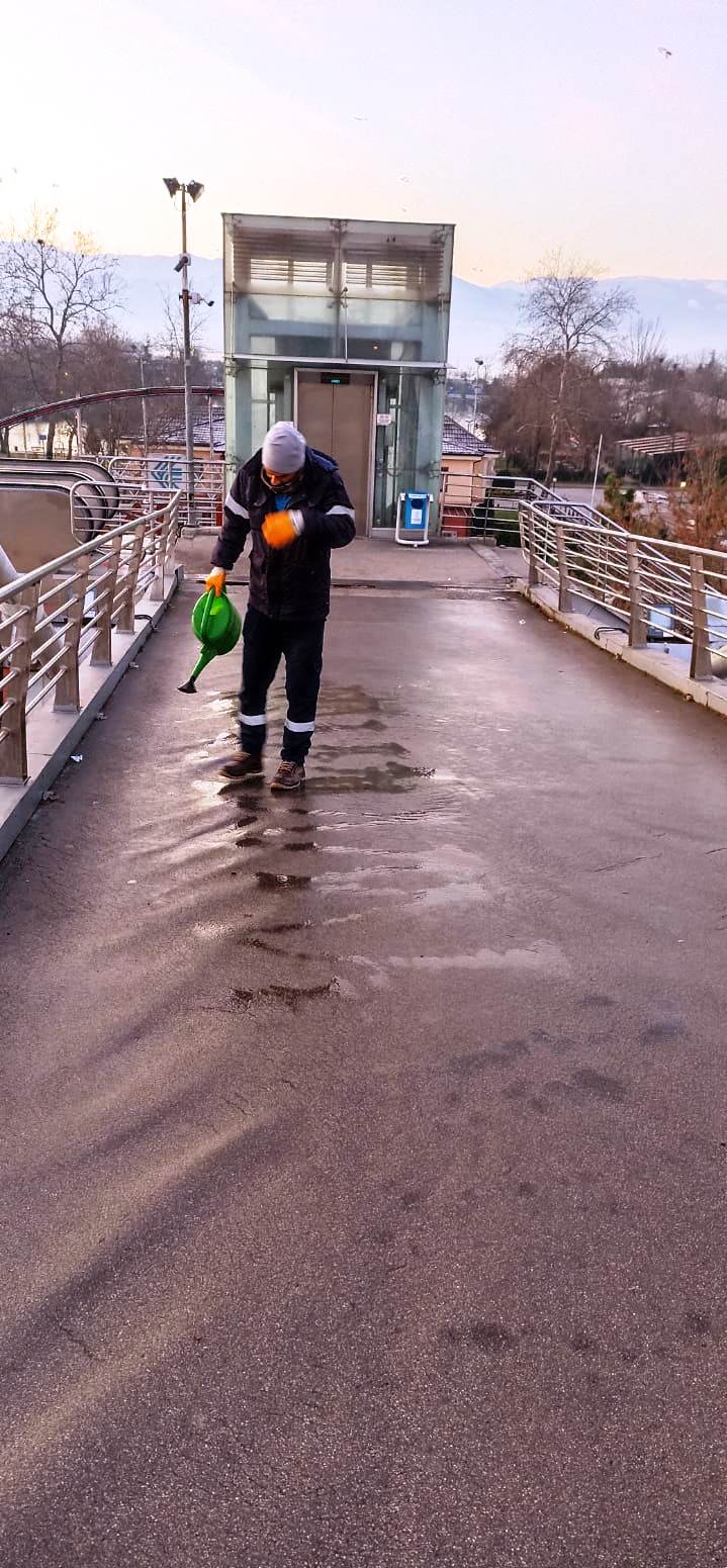 Park ve Bahçeler Dairesi Başkanlığı ekipleri, buzlanma olmaması, vatandaşların kayarak zarar görmemesi için çalışmalarına gece geç saatlerde başlıyor. Ekipler buzlanmadan dolayı yayaların zarar görmemesi için solüsyonla temizlik çalışması yapıyor.